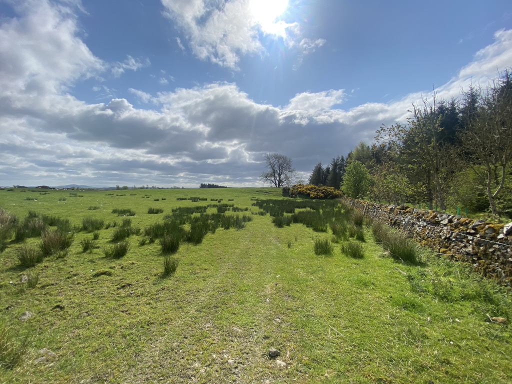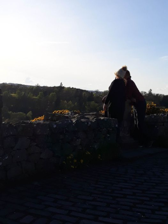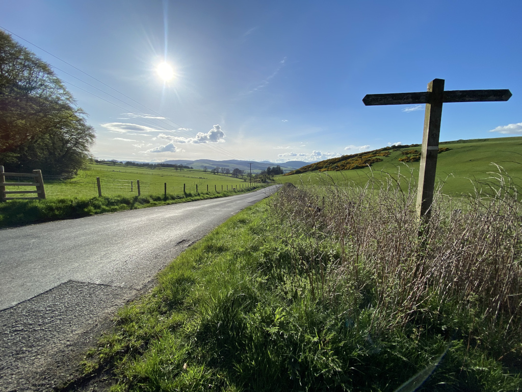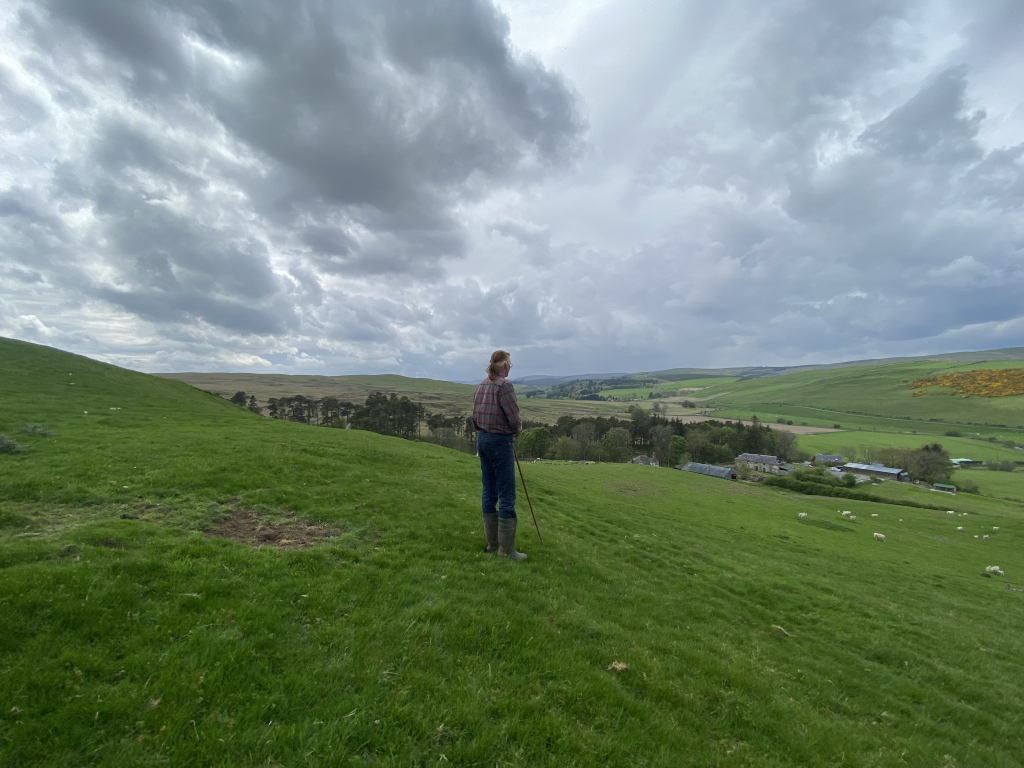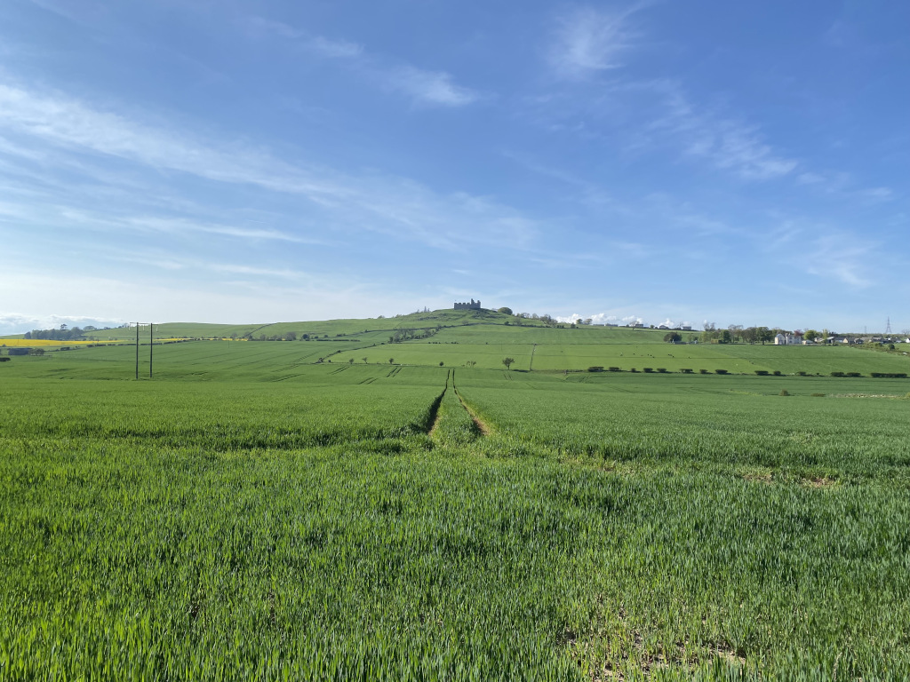 Charlie intended to take us to Scots viewpoint to view the Eildon hills after visiting the two grass keeps. The view was significantly more verdant, with bright yellow gorse announcing its presence, compared to my previous visit.