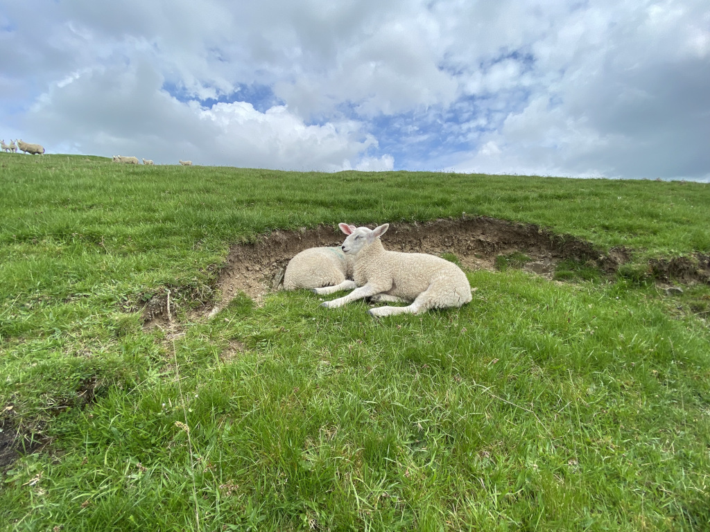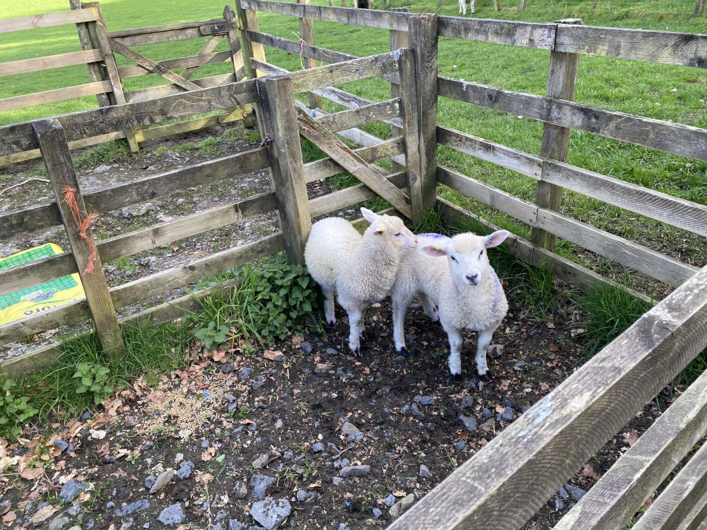 Deciding to go look for two missing lambs I walked up the lane, whilst Charlie navigated his ascent upwards through the paddock. I walked through a wooden gate, and across pasture to find two lambs cuddled up together.