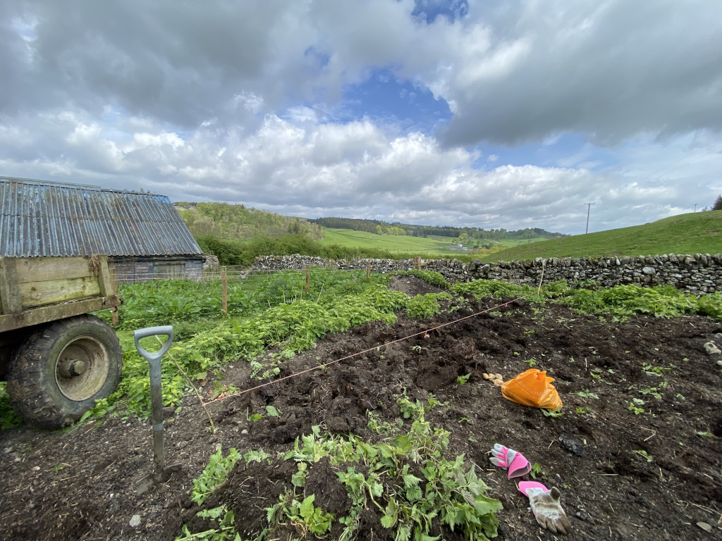 The other thing we had planned was to weed the vegetable patch, to the rear of the farmhouse. Breaking the soil we noticed the presence of worms, this is a good sign, but also strange flies appeared, we had no idea what they were so left them be. I forked out large clumps of nettles whilst Charlie turned over the soil. We managed to plant one row of potatoes before retiring for a coffee. The poorly lamb, sick from eating too much wheat, was found dead this morning; made Charlie promise me he won't feed lambs wheat again.