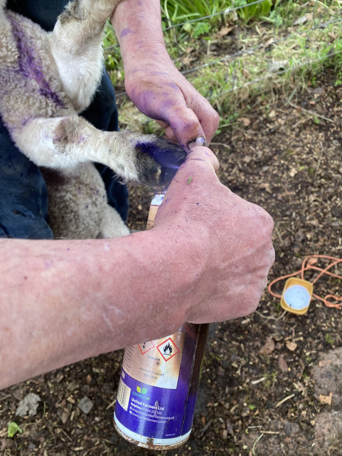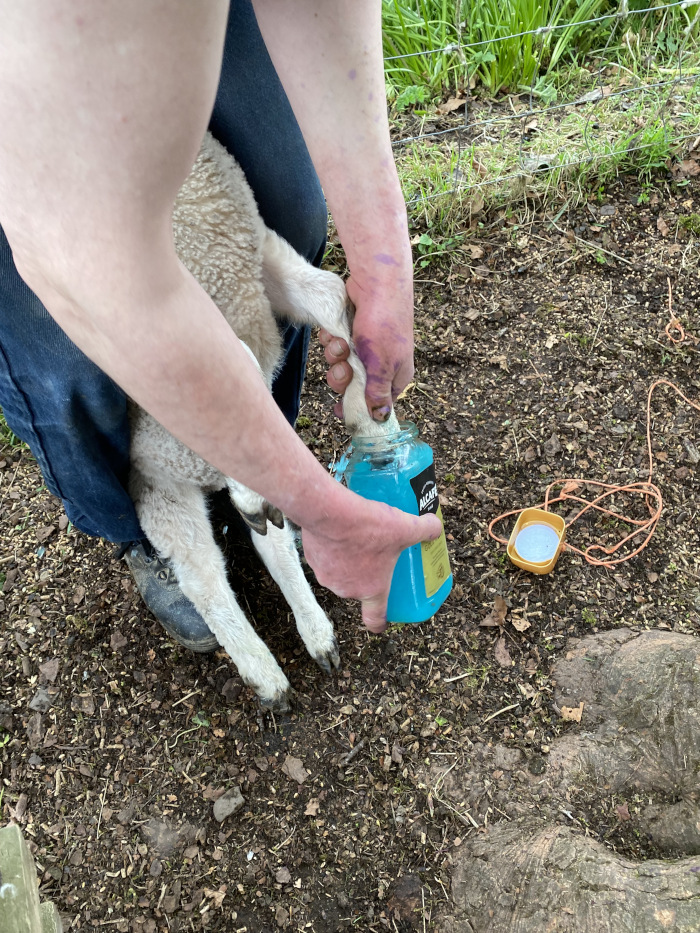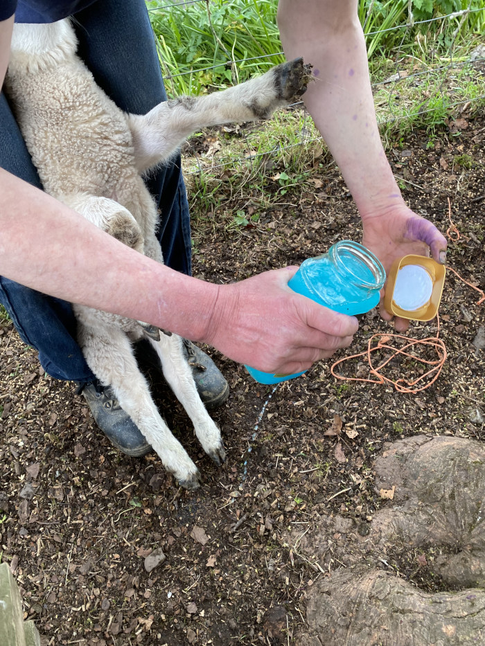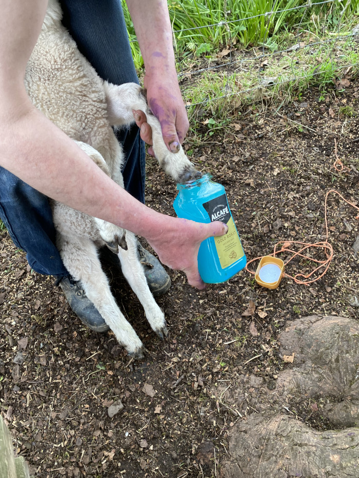Today, our objective was to examine and address the scald on the lambs' hooves, which is a frequent occurrence during the early spring. Five lambs and their mother ewes were confined and corralled in a paddock. Only one lamb with a fever around the hoof was given an antibiotic injection. Some of the worst lambs were dipped in a jam jar (we don't have a run here) with a mild copper sulphate solution, which is bright blue in colour. All of them were then sprayed with Cetrigen, an antibacterial spray that gave their hooves a deep purple colour.