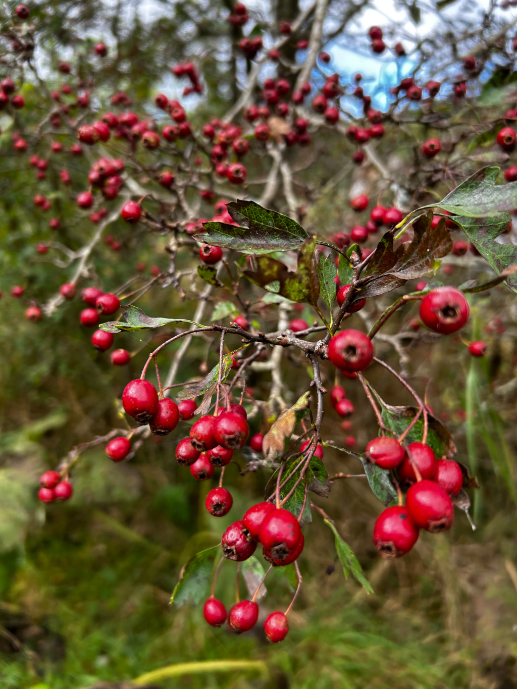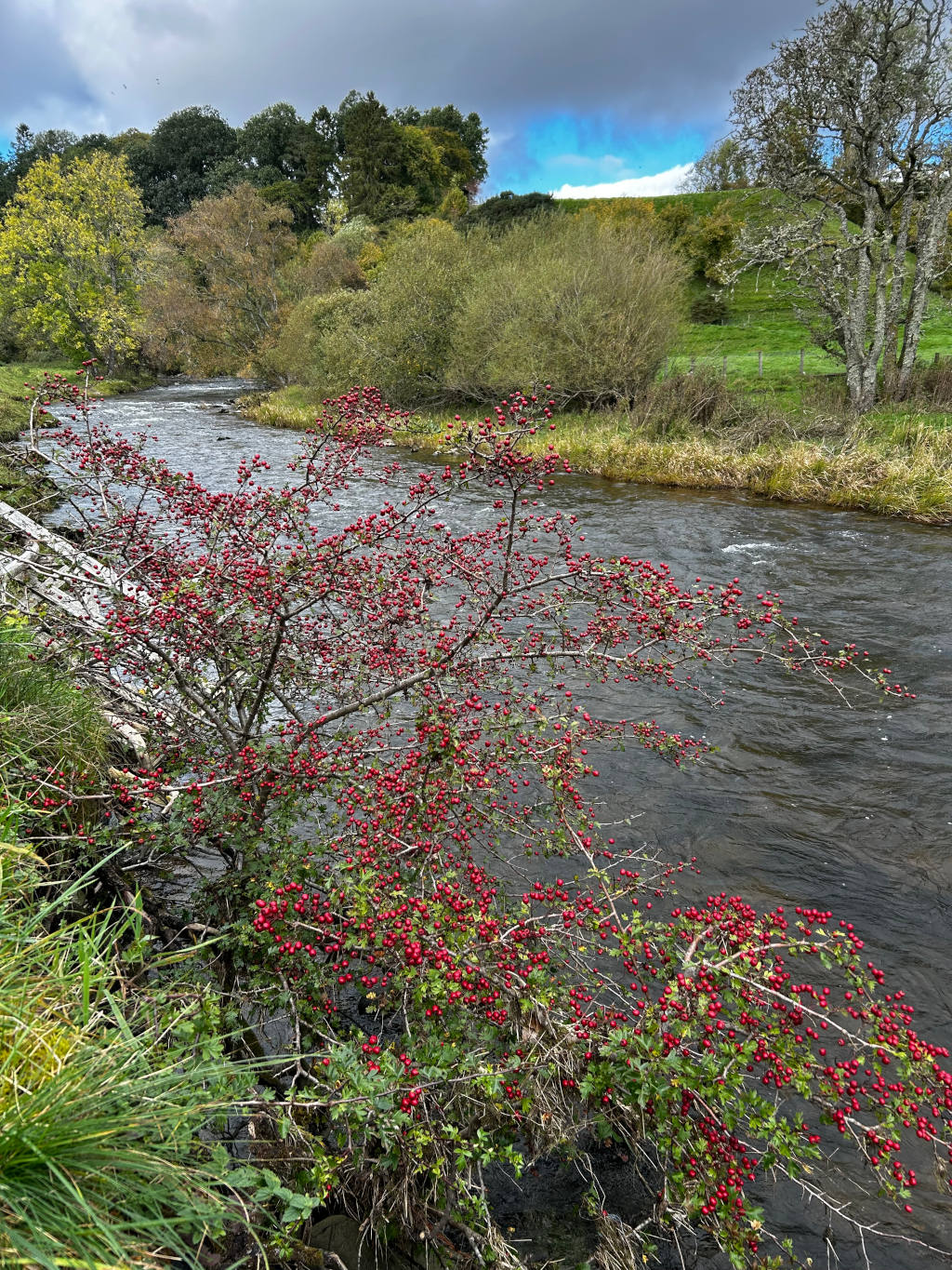 Striking definition of these berries, pale in the swirling grey waters of the Borthwick.