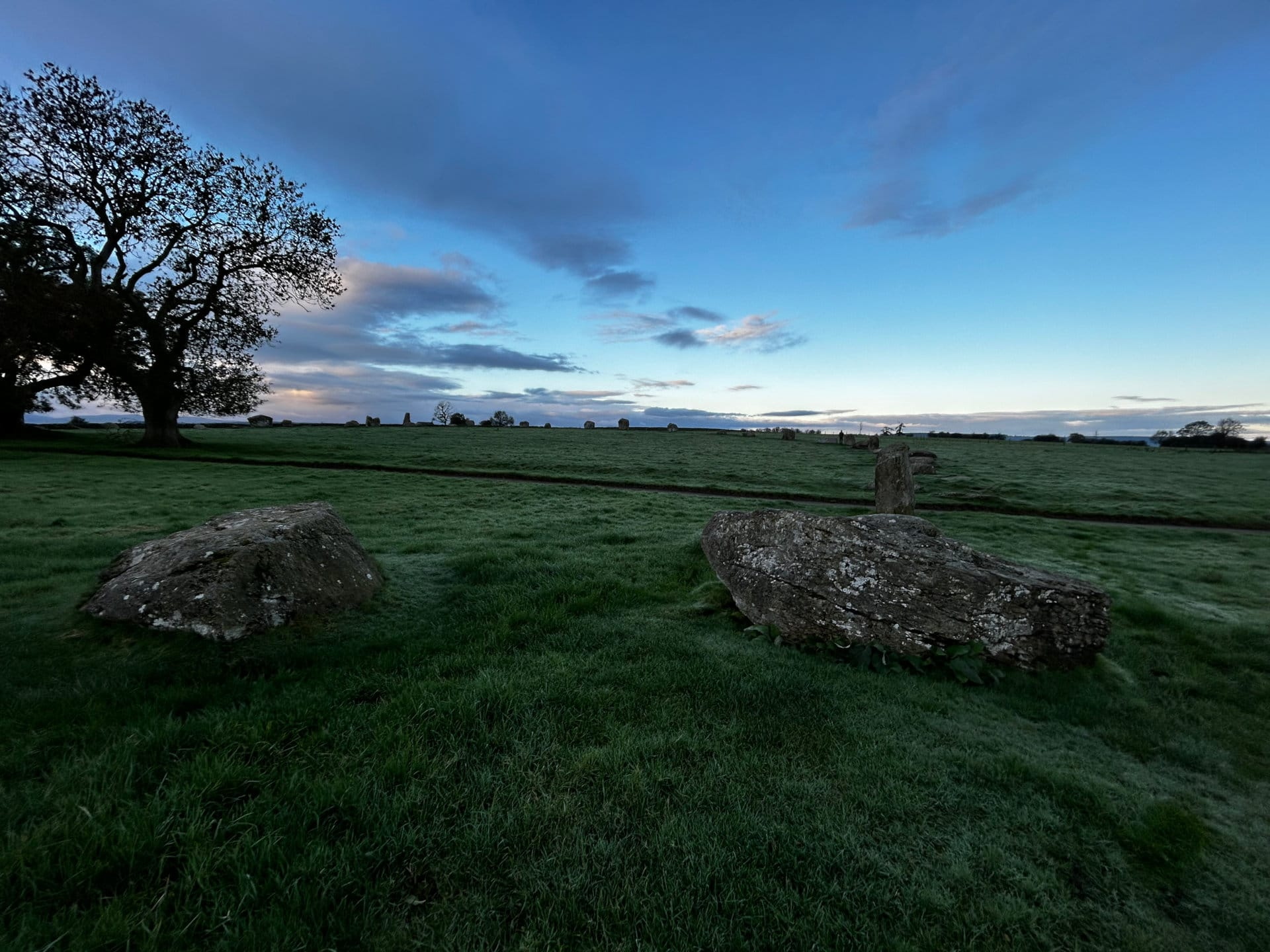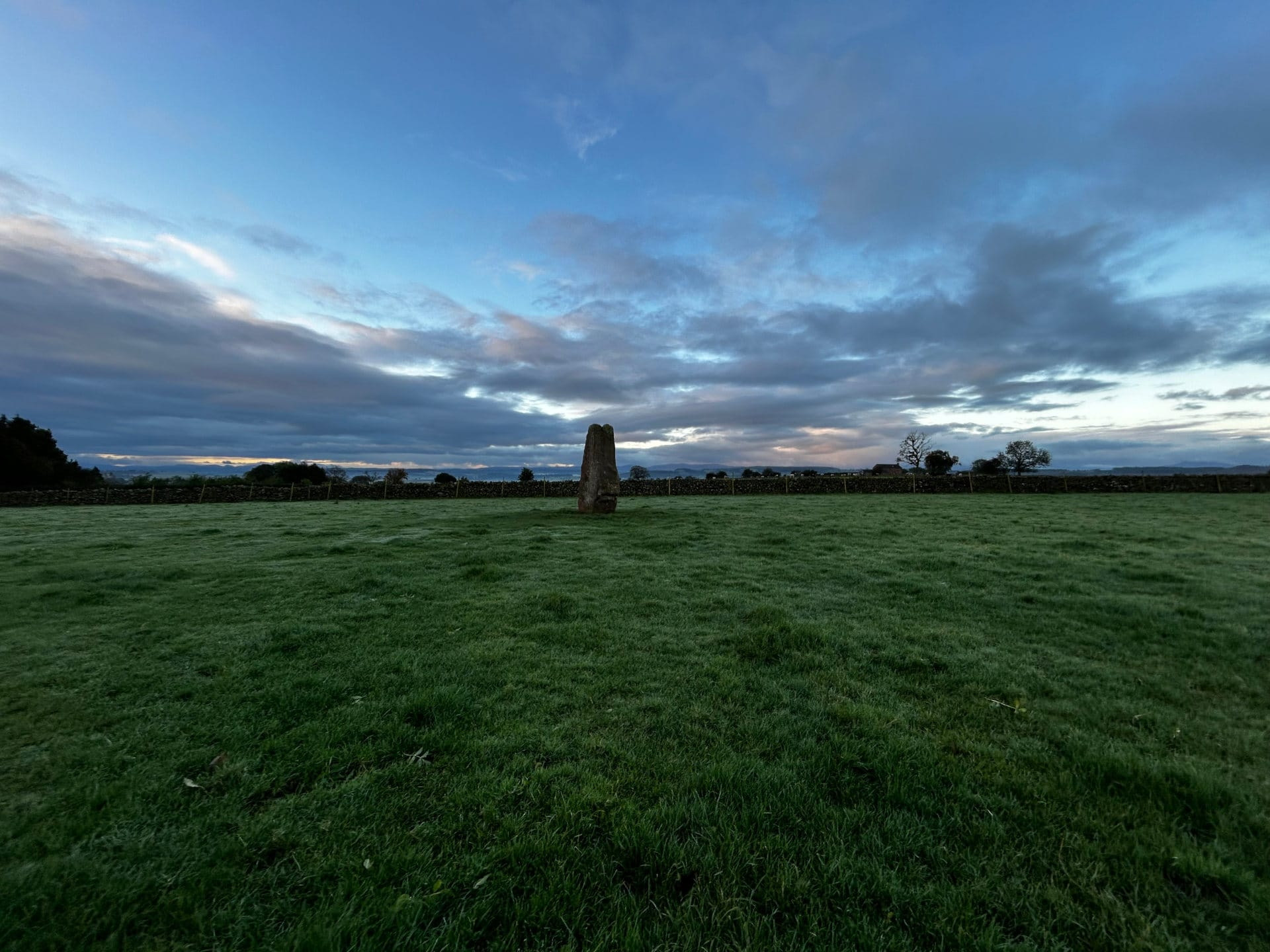 Approaching midnight, we reached Scotch Corner A1/A66 service station. Emersed in tiredness, Charlie pondered upon an ANPR notice allowing only two hours parking. We had aimed to get a few hours sleep here; but left at 1:15am to travel towards Penrith. Gaining three hours sleep near a village named Bowles, we continued our journey, reaching Long Meg stone circle at day break. I've visited many stone circles throughout the UK, but it's always interesting watching Charlie's observant reactions.