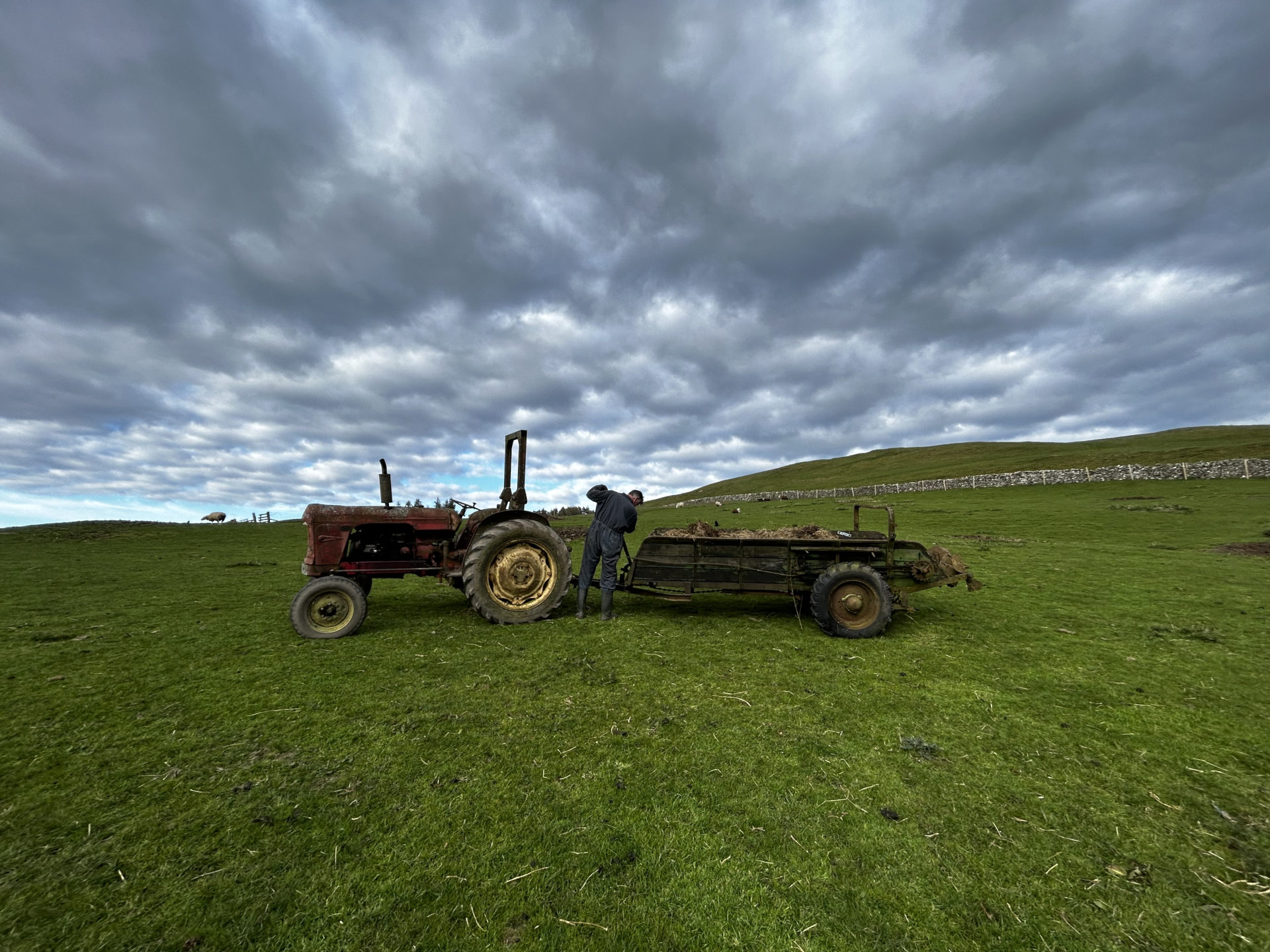 Charlie fertilising the paddock with muck; his spreader is eighty years old.