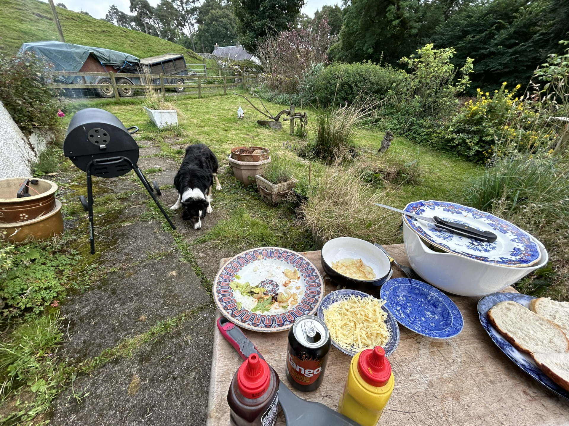 The sheep dog prefers a puddle of rain water to a clean bowl of spring water from our farmhouse tap. He likes eating bread and butter, more so when saturated with dripping.