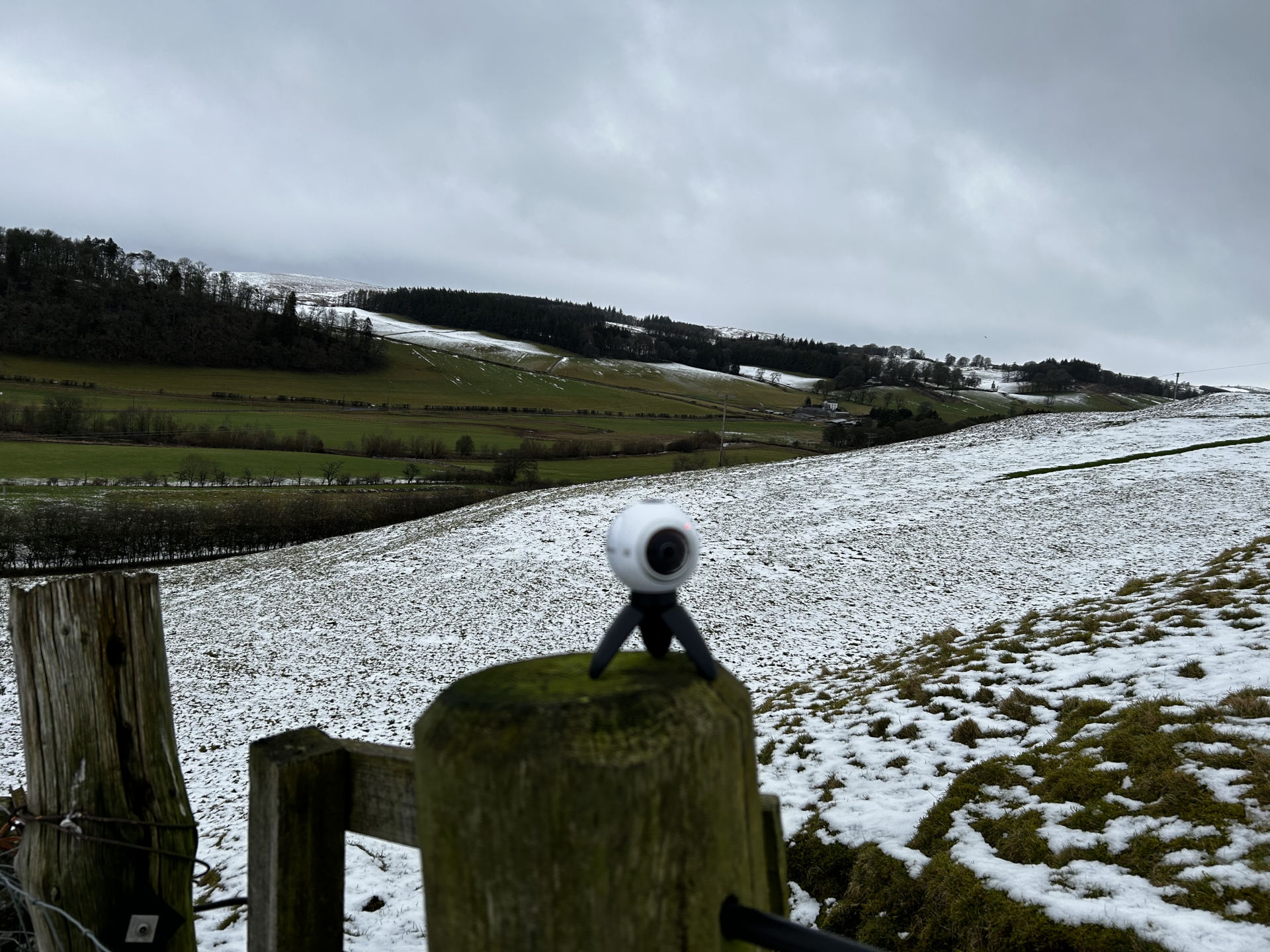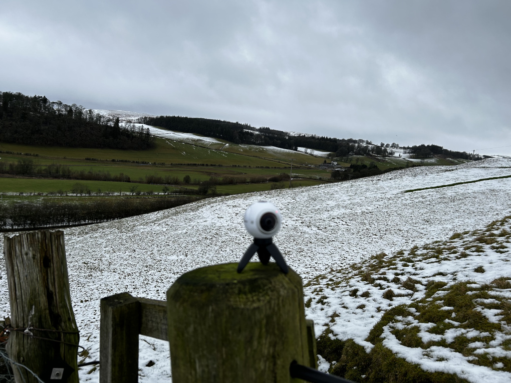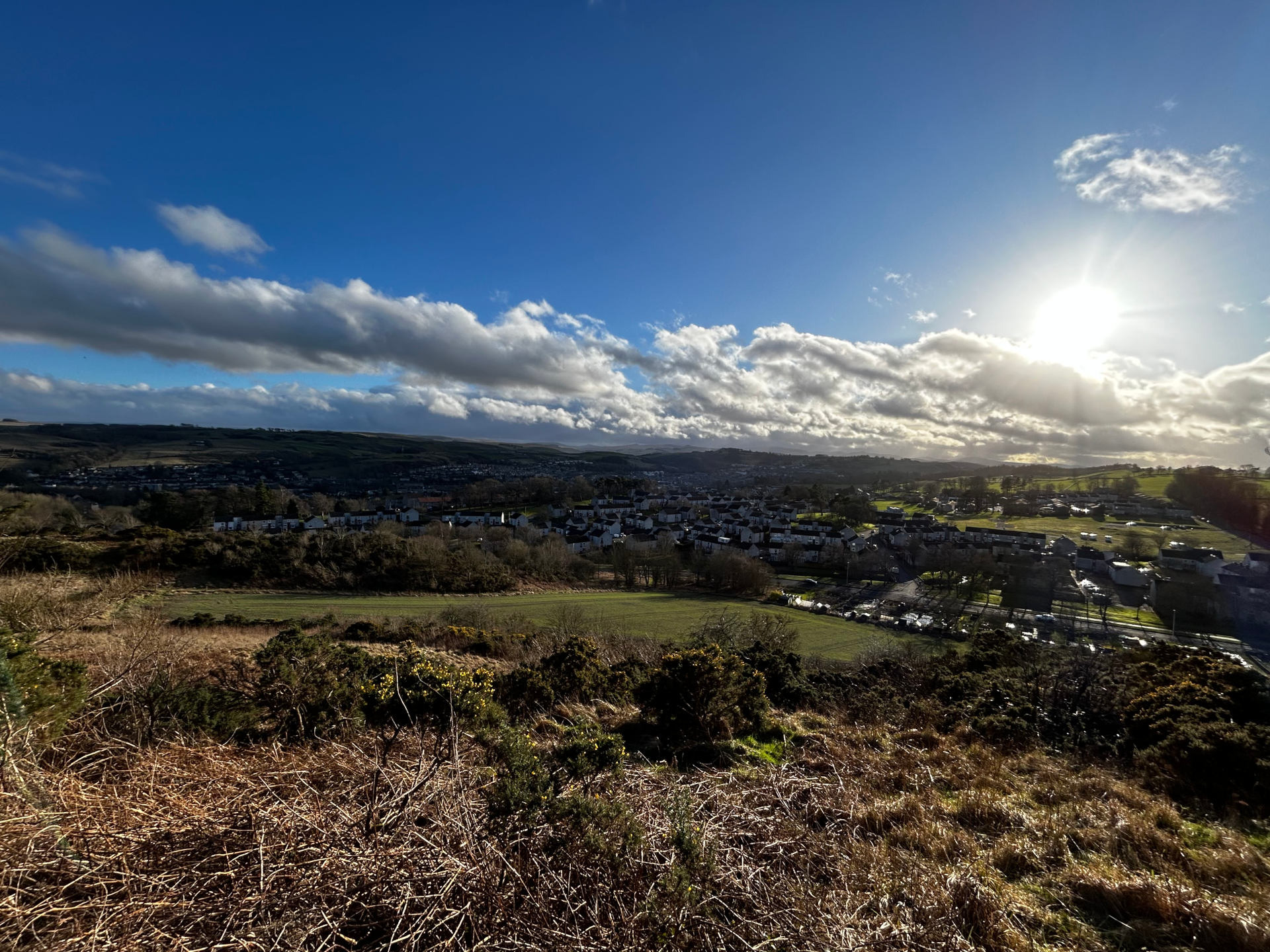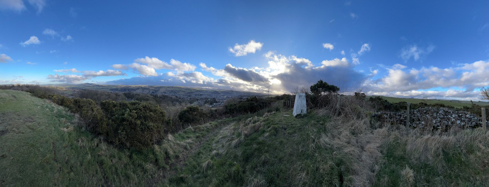This afternoon I walked to Galalaw viewpoint, halfway along my ascent I met a friendly horse, who became spooked by my spherical camera . Further along, Charlie rang, and I arranged to meet him on the hilltop; the weather was sunny, with dreamy fluffy white and grey clouds. I enjoyed the walk, fresh air helped alleviate anxiety from cPTSD.