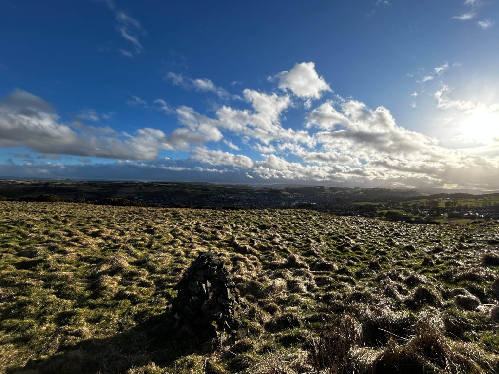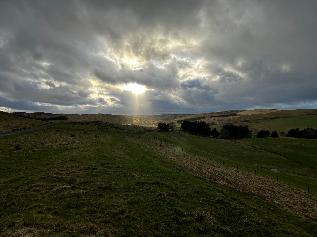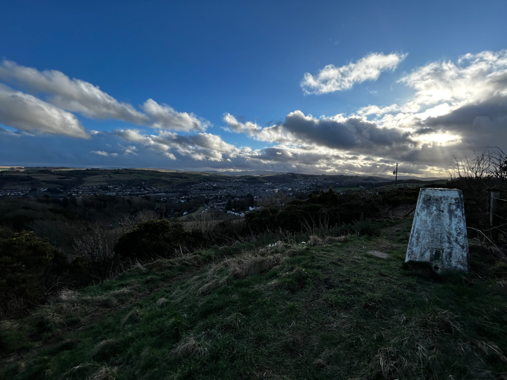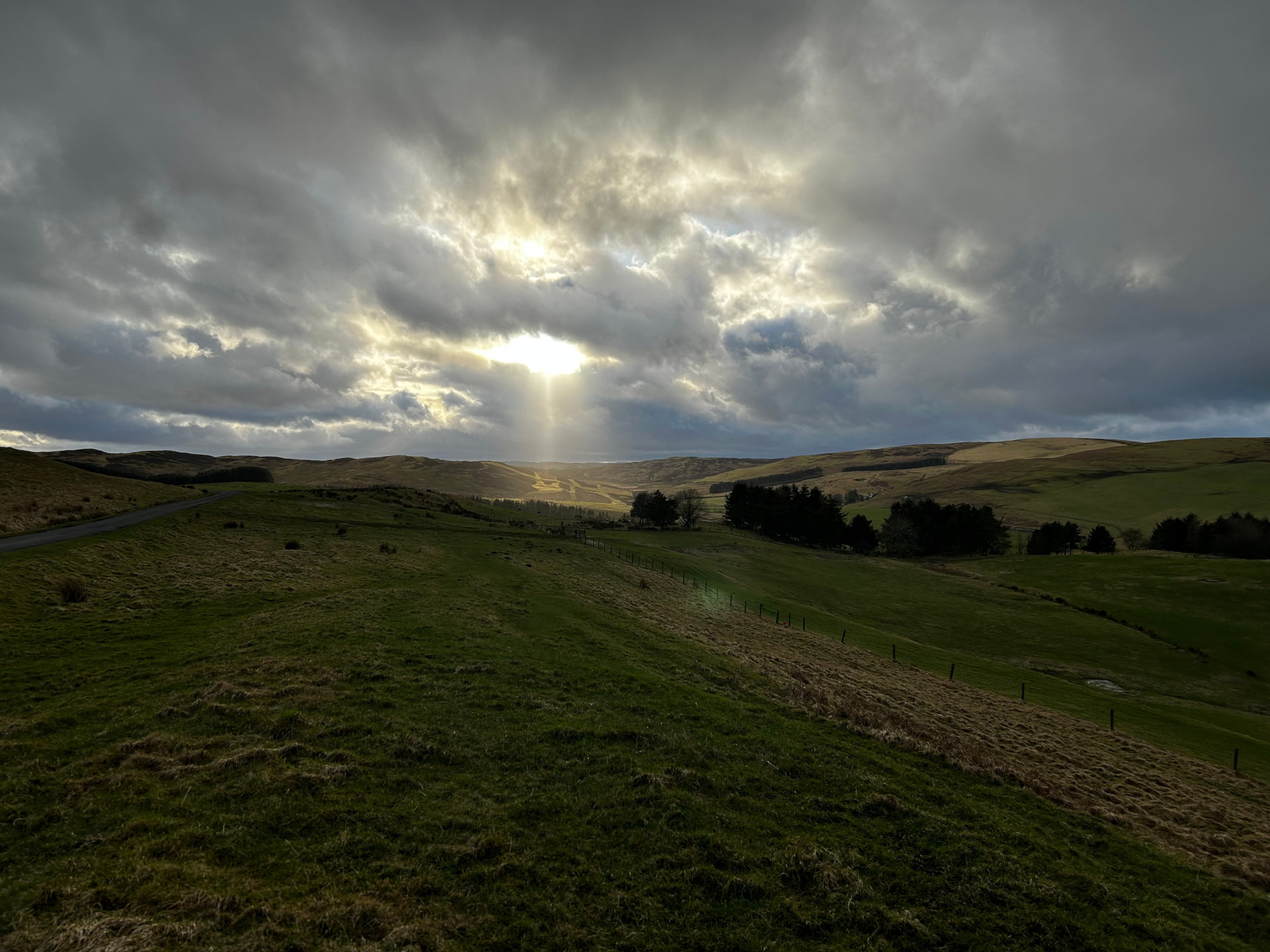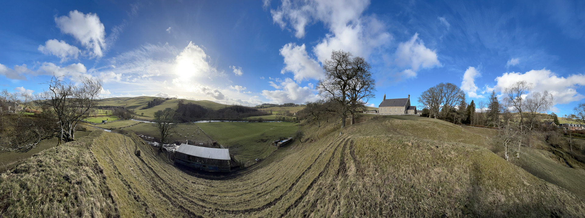 This afternoon I walked to Galalaw viewpoint, halfway along my ascent I met a friendly horse, who became spooked by my spherical camera . Further along, Charlie rang, and I arranged to meet him on the hilltop; the weather was sunny, with dreamy fluffy white and grey clouds. I enjoyed the walk, fresh air helped alleviate anxiety from cPTSD.
