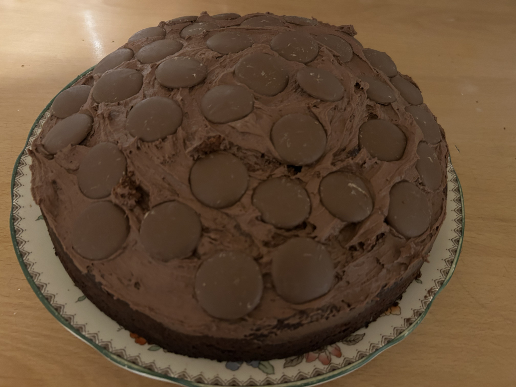 In the afternoon, I baked a chocolate cake, then in the evening, after Charlie purchased more chocolate, I made butter icing to top the cake. Smaller cake tins are required to make two layers; so that the butter cream to be sandwiched rather than spread on top of the cake.