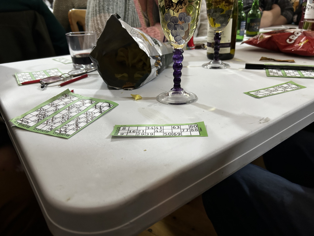 Tonight I played bingo with the people of Borthwick valley, sat beside a neighbour and the wardens of the hall; I came close to winning with just one number (15) to be called, but Charlie had terrible luck, aghast and struggling to comprehend seven numbers still not yet marked on his bingo card. We enjoyed light refreshment, a bottle of white wine, and salted crisps, bought by ourselves.
