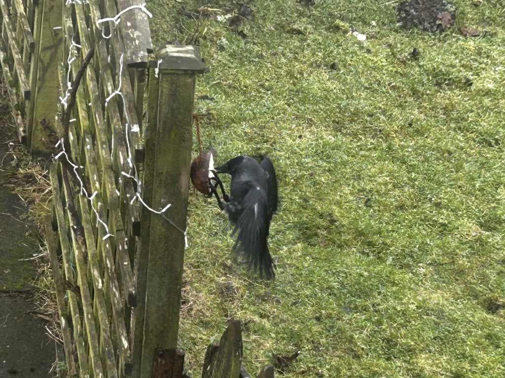 The jackdaw's from the old barn (now not part of this farmhouse) have learned from the Great Tits that there is bird food contained with the hanging coconut husk. These are very agressive and greedy birds, and have probably pushed the Great tits out, but they are birds so I'll let them feed. I have not seen the partridge family, but Charlie seen them a few days ago, down to four in number now.