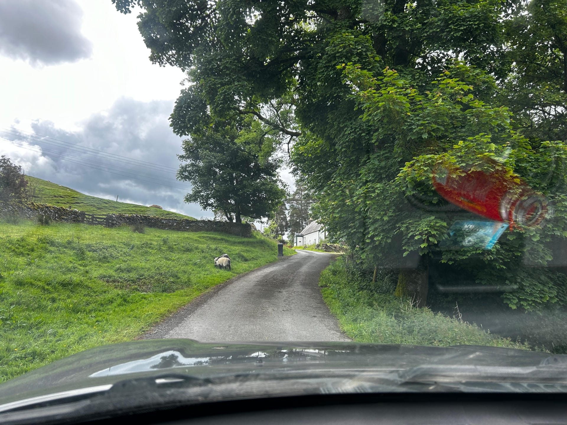 We returned to Woodburn to find our Herdwick ewe and lamb had climbed over a stone wall and were grazing by the roadside. Her other lamb behind the wall was crying.