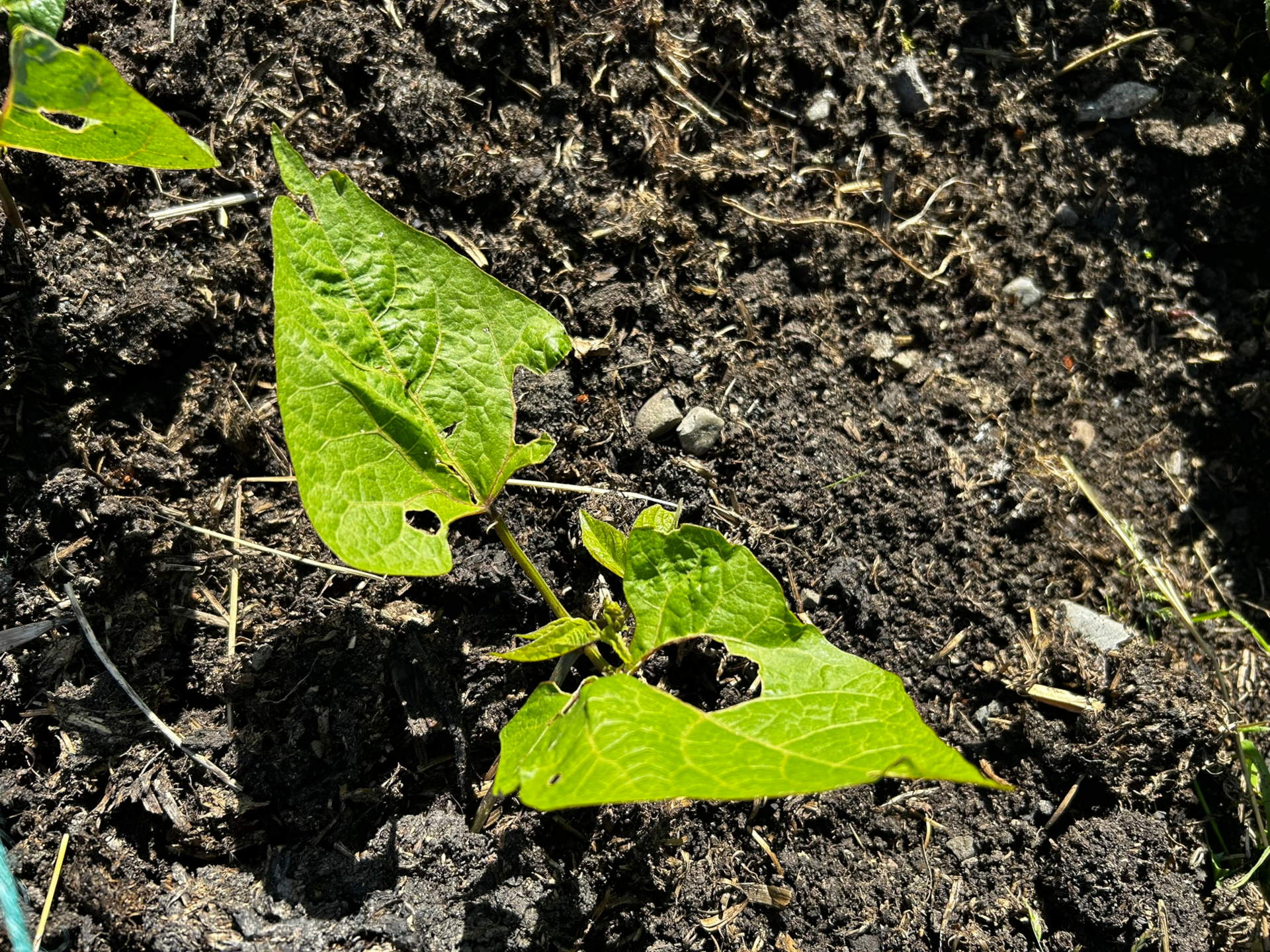 Our beetroot and onions have grown, but our bean plant leaves have been eaten away. Potatoes are growing faster from seed this year than they did from old left over potatoes.