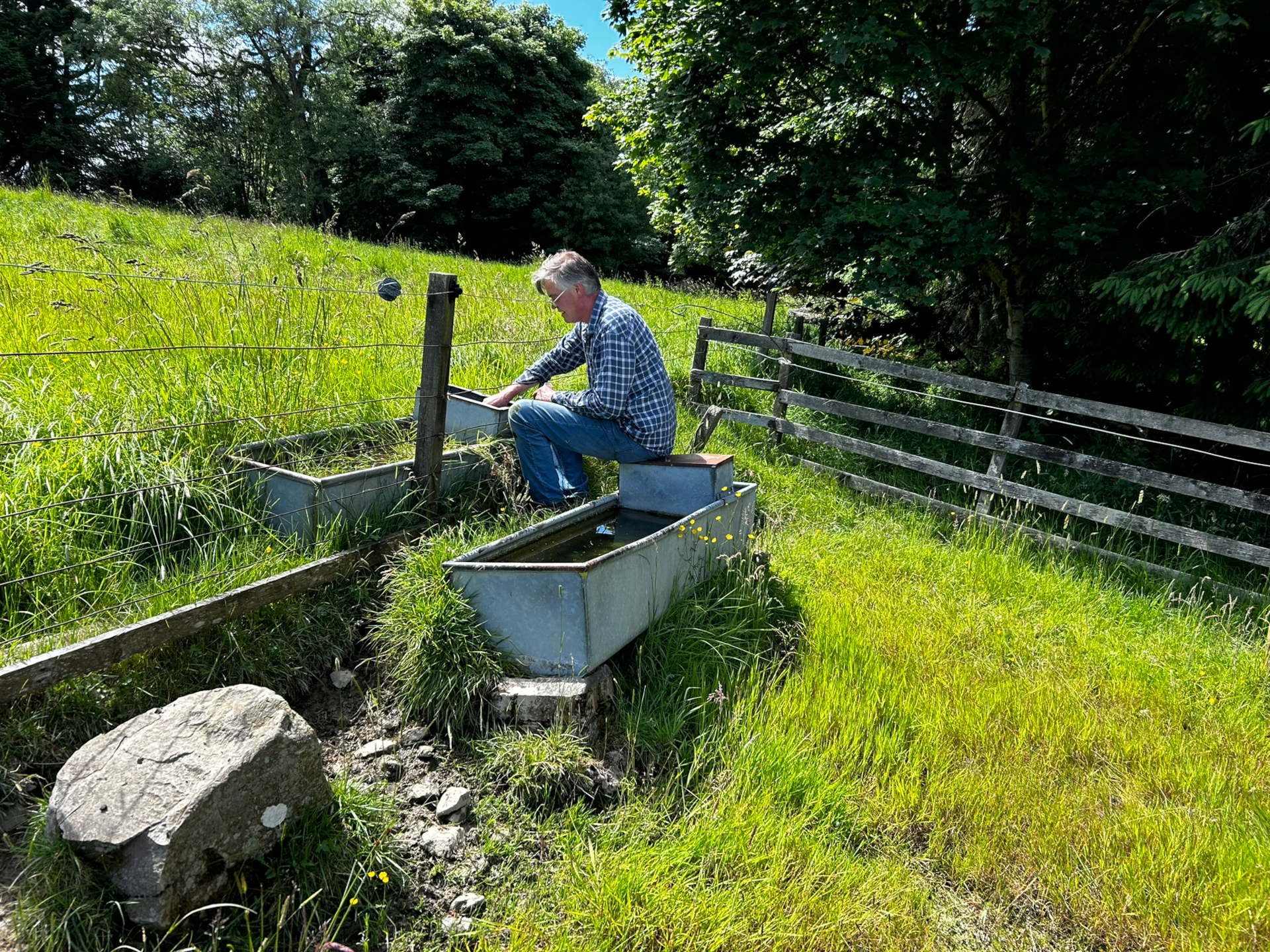 We walked to the sheep drinking trough, Charlie wash sheep shit off his hands and filled his water bottle up; I used to drink from the mains pipe, when I was rambling and camping.