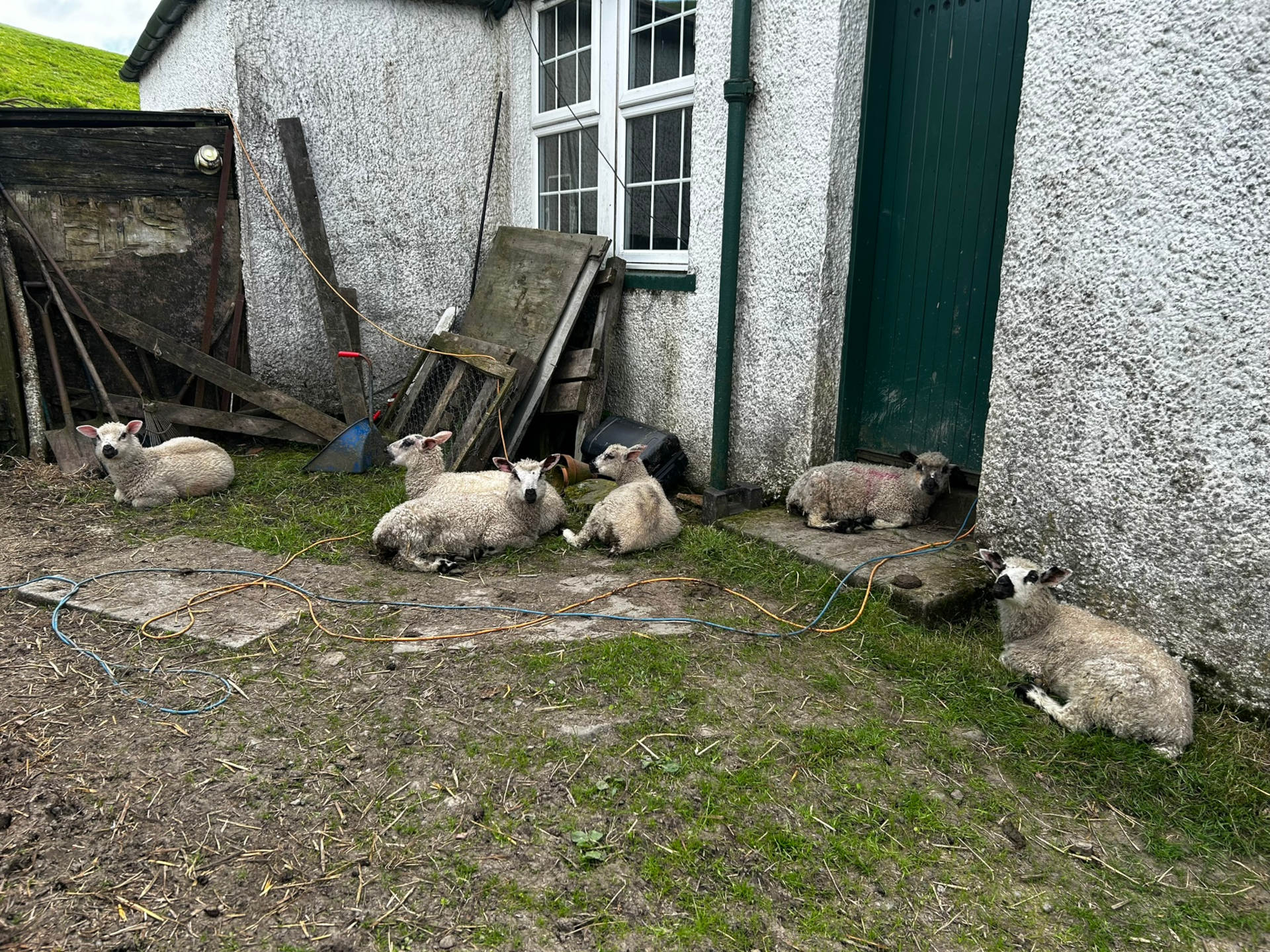 The cade lambs were cooling down within the shadow of Woodburn farm house.