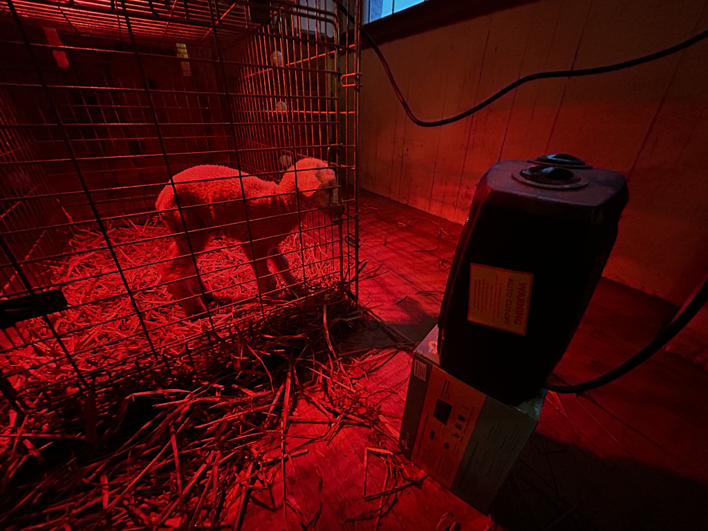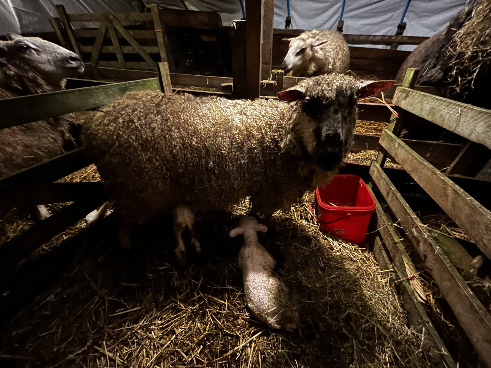 We have removed the white lamb from its black mother. The little lamb is sick with watery mouth, having not received enough colostrum because her mother bunted her away; she managed to sneak past the black lamb to suckle, but evidently this was not enough. We've placed her with two other friendly mother ewes, Charlie administered a shot of antibiotic, she's drank a quarter of a bottle of powered milk this morning, considering this substantial intervention she'll pull through as another full cade, to keep cades company.
