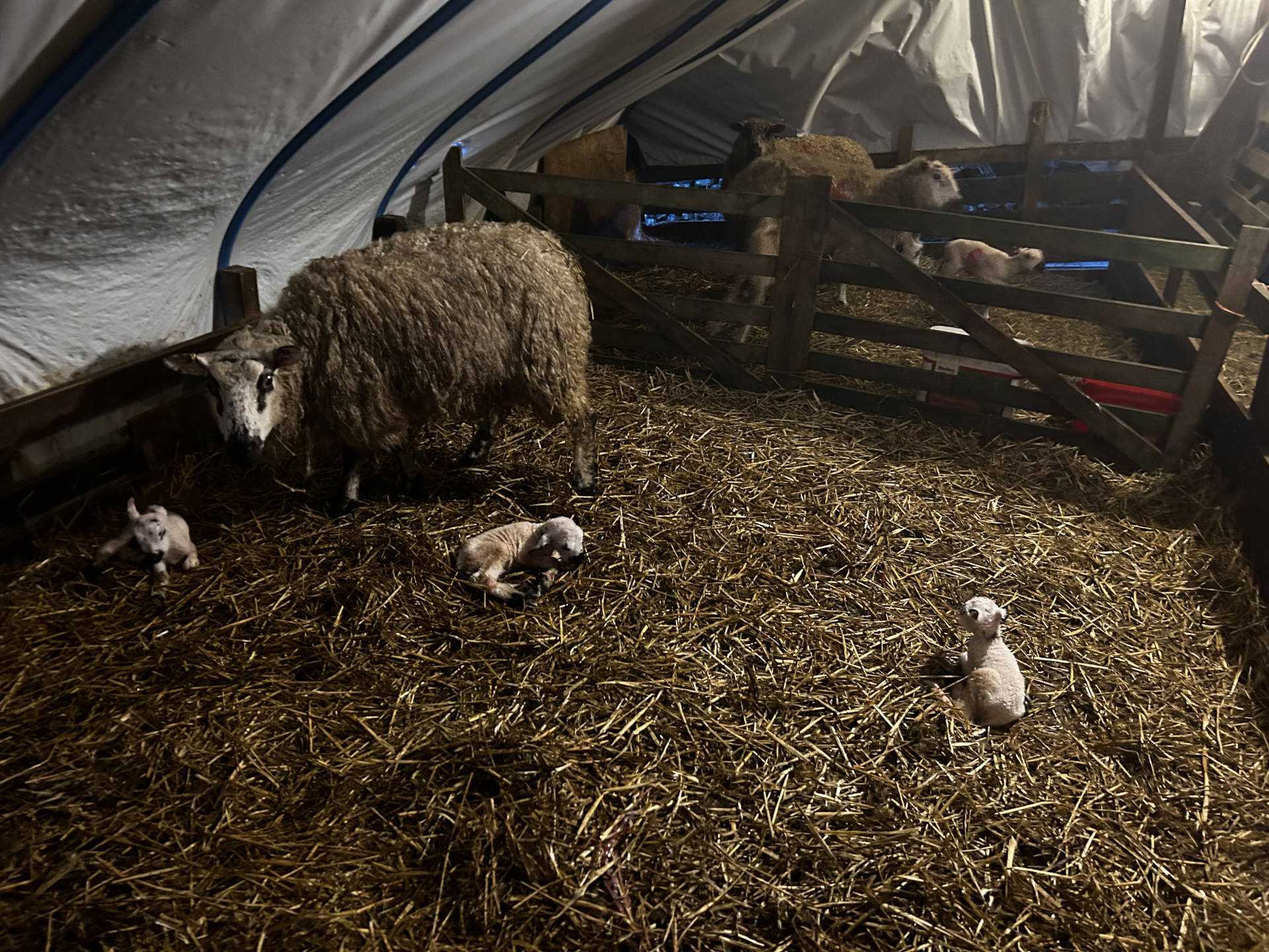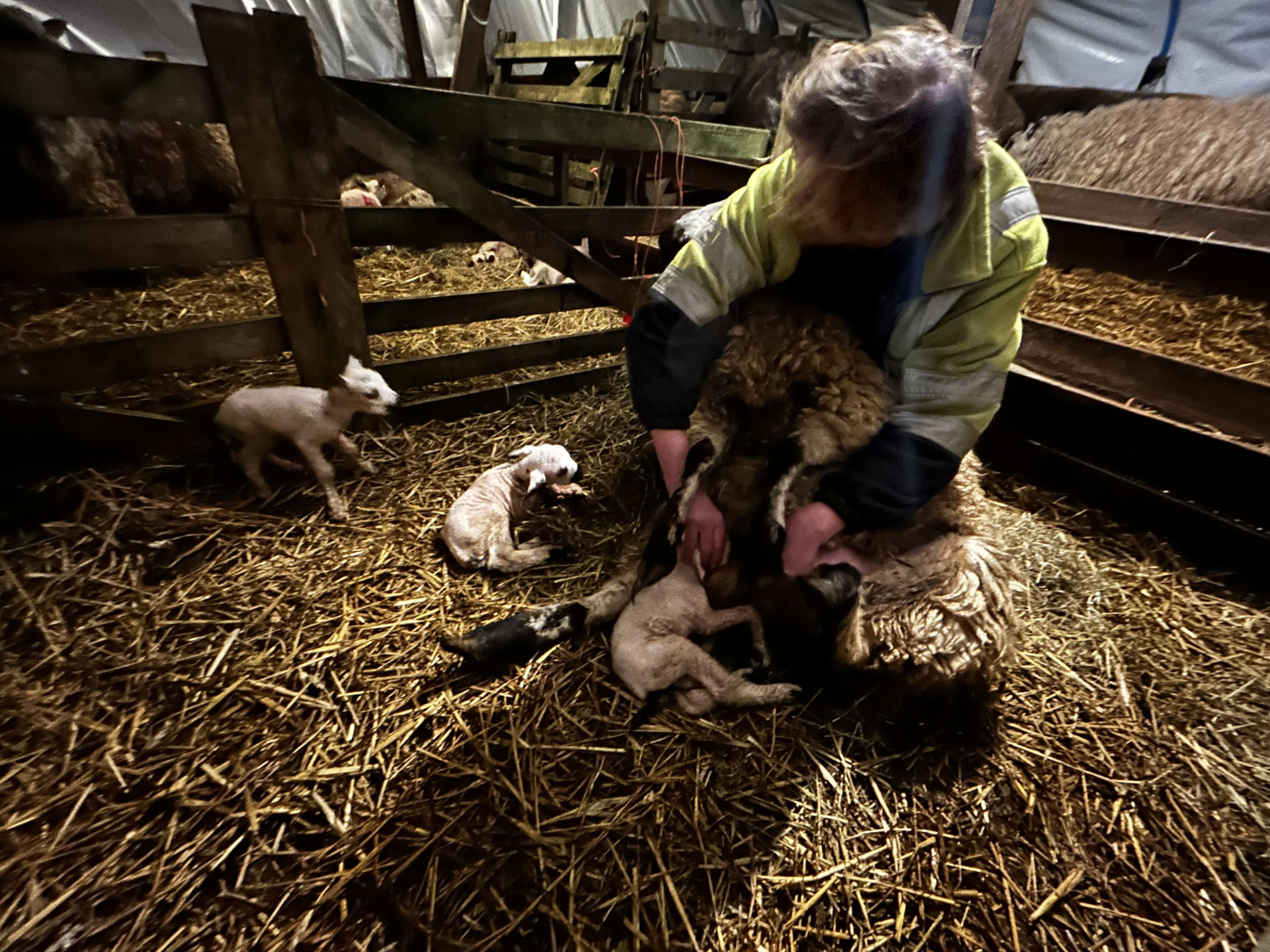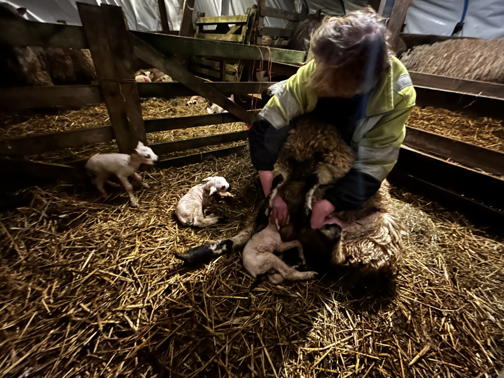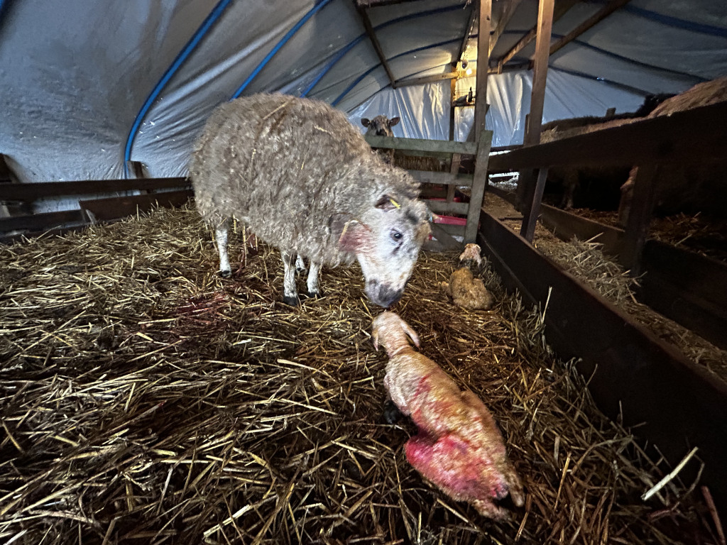 Sam the sheep dog, I let him out of his kennel to stretch his legs, trusted he enters the polytunnel, invades a mother ewe lambing triples, and begins licking her lambs; how insane is this?