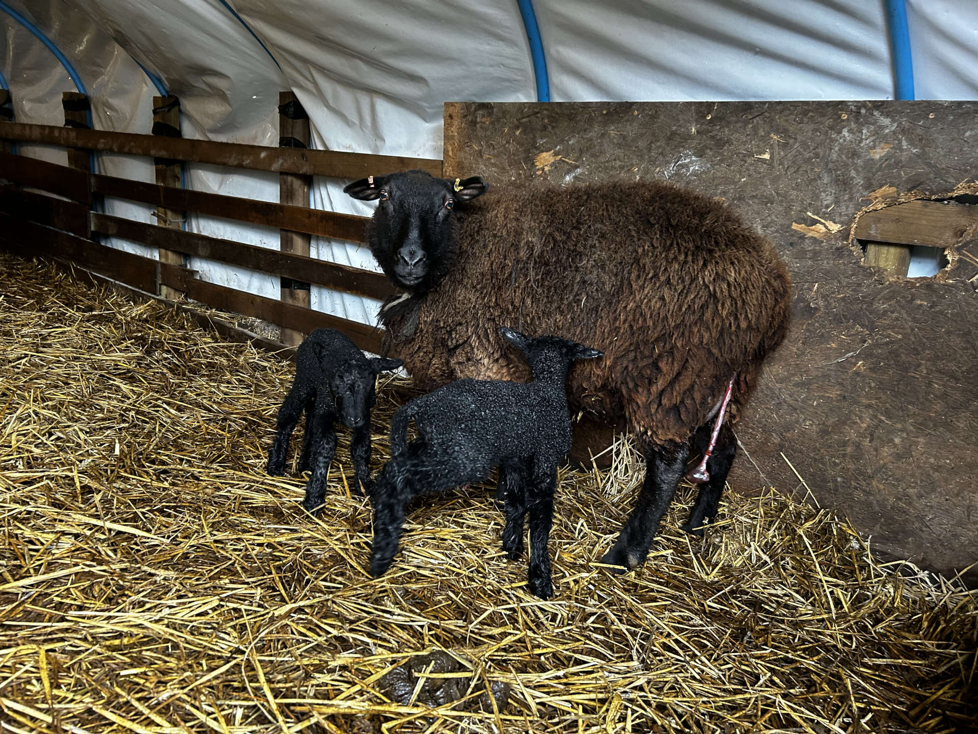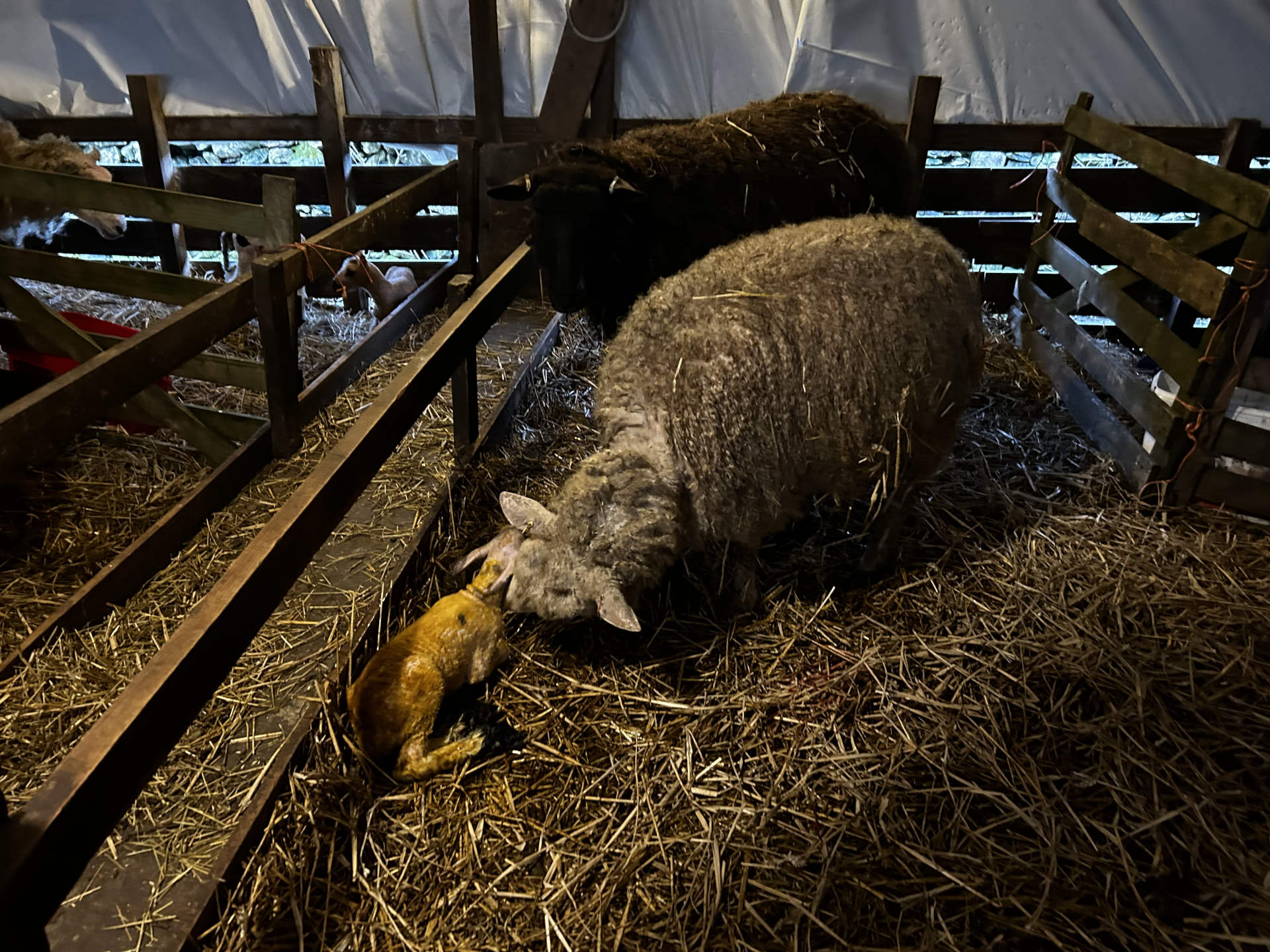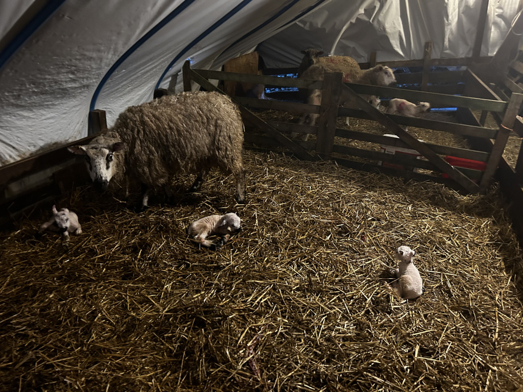 Sam the sheep dog, I let him out of his kennel to stretch his legs, trusted he enters the polytunnel, invades a mother ewe lambing triples, and begins licking her lambs; how insane is this?