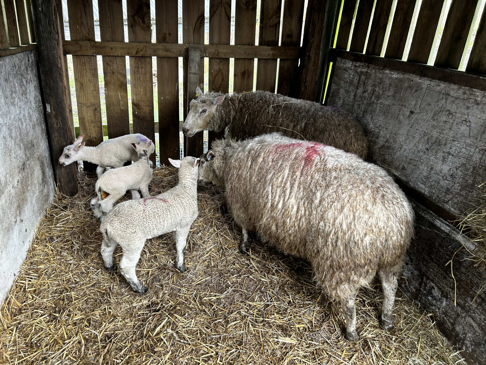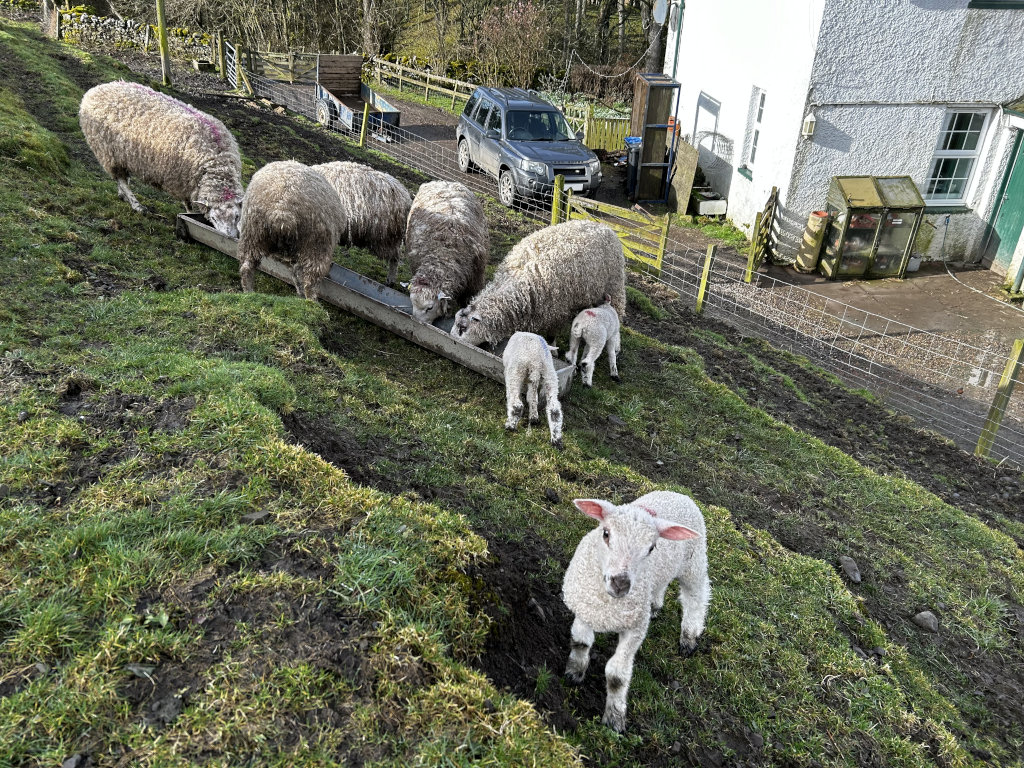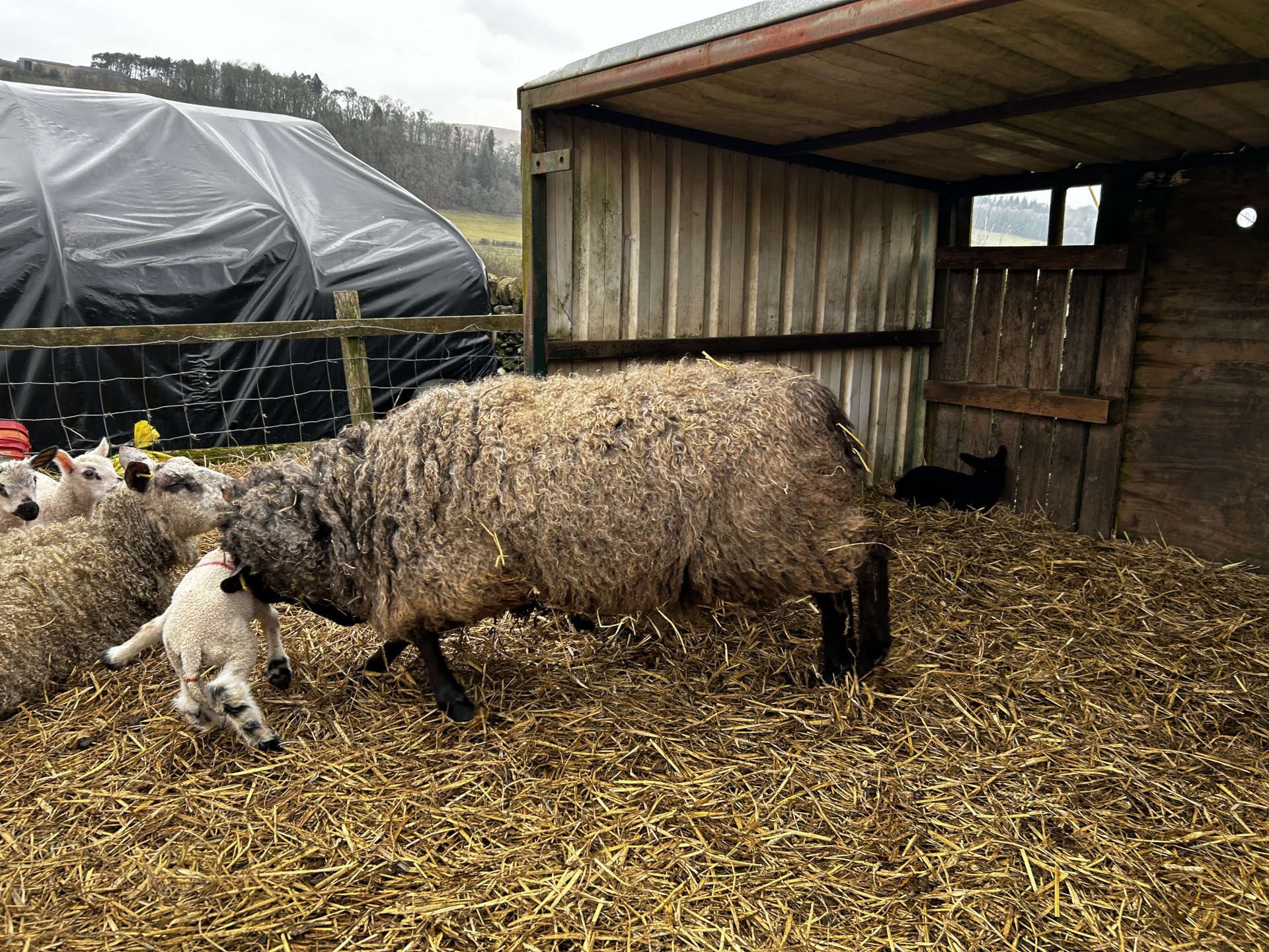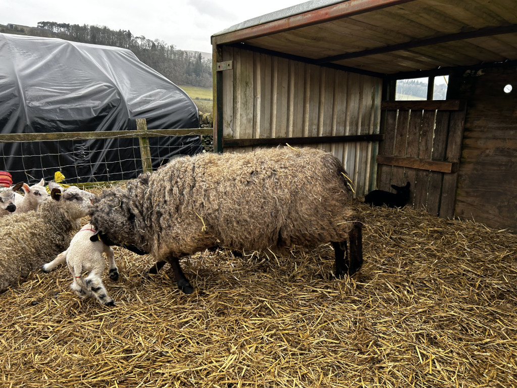 The pens are initially small to restrict movement of the mother ewes to allow the newborn lambs to suckle essential colostrum; after no problems for two / three days they are moved outside into a large pen with other mother ewes and their lambs. Every penned mother ewe has access to water, chaff and haylage; they are also given fresh straw bedding daily.