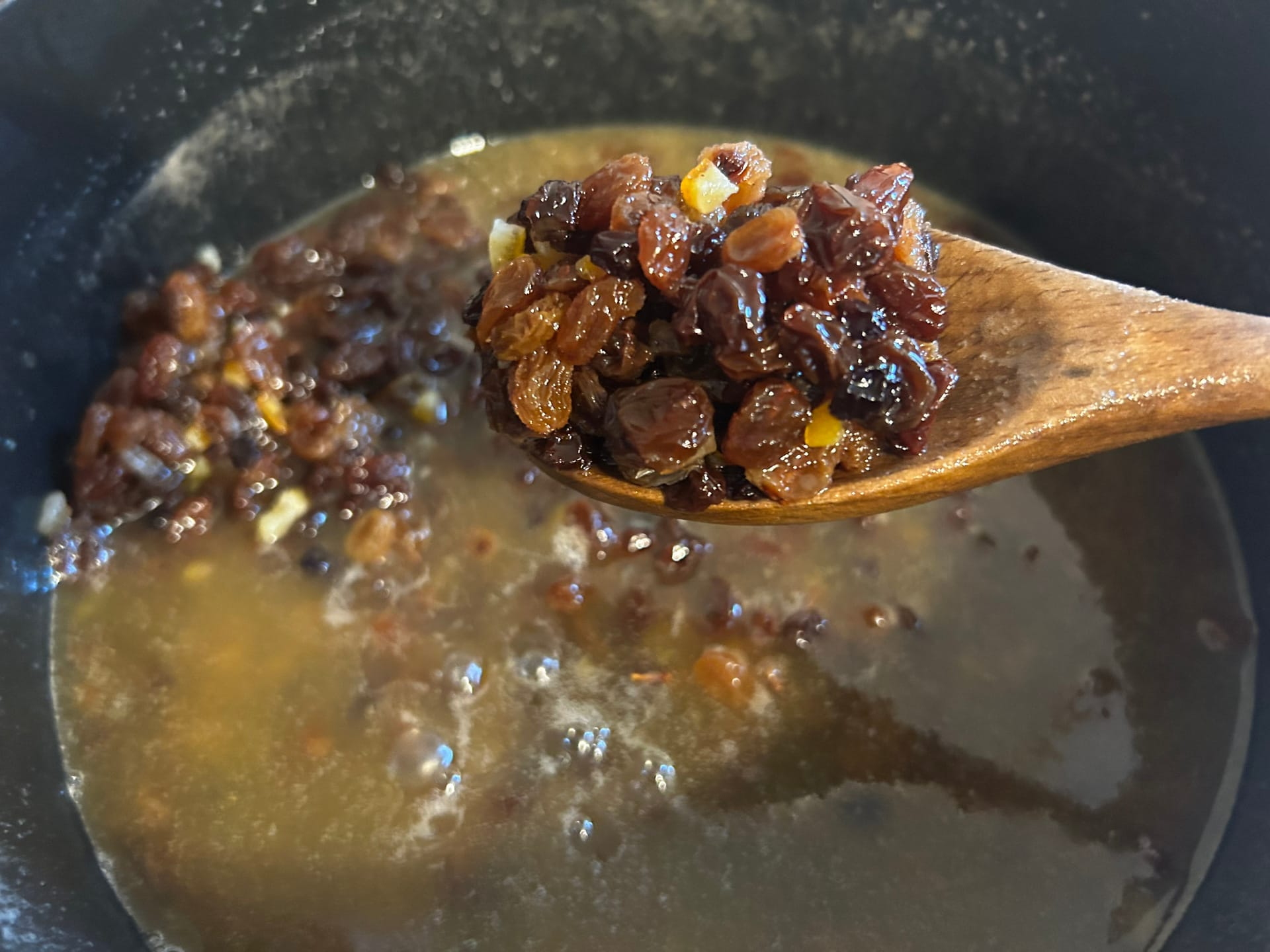 Heat the oven to 180C. And butter and circular cake tin. Melt the sugar, butter and 225ml water in a large saucepan. Once melted, add the mixed fruit. Bring to a gentle boil, and stirring occasionally, cook until reduced and softened, around 10-15 mins. Remove from the heat and leave to cool to room temperature.