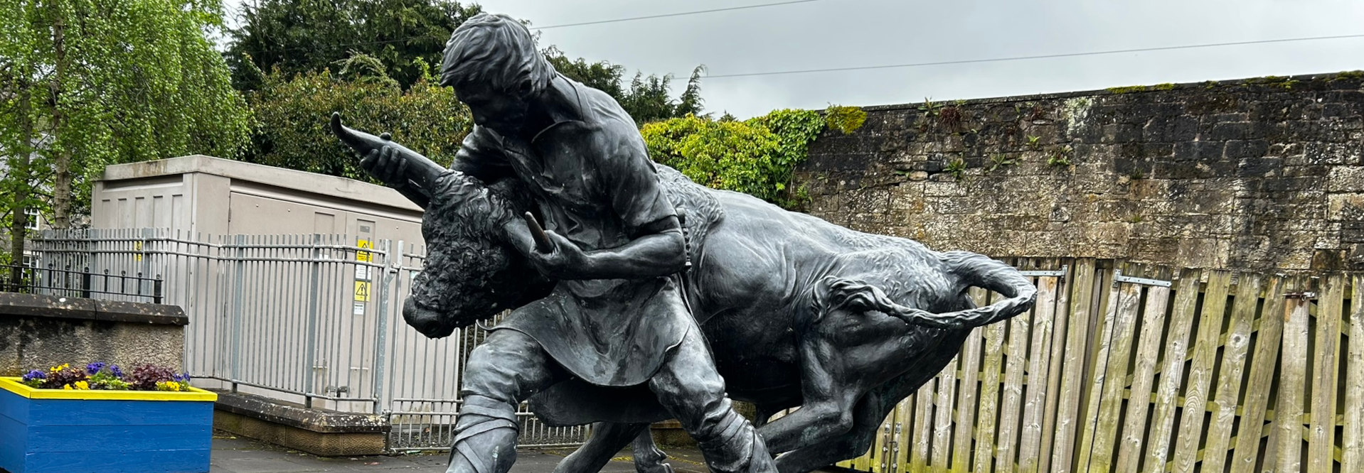 The "Return from Hornshole" statue, was funded by the Common Riding Committee of Hawick. The statue celebrates the slaughter of a group of sleeping English "soldiers" whilst they were camped overnight at Hornshole. During Hawick's Common Riding, the chosen Cornet carries a replica of this very flag. The flag belonged to Hexham Abbey, dedicated to "St Andrew" (St Andrew is celebrated as patron Saint of Scotland).