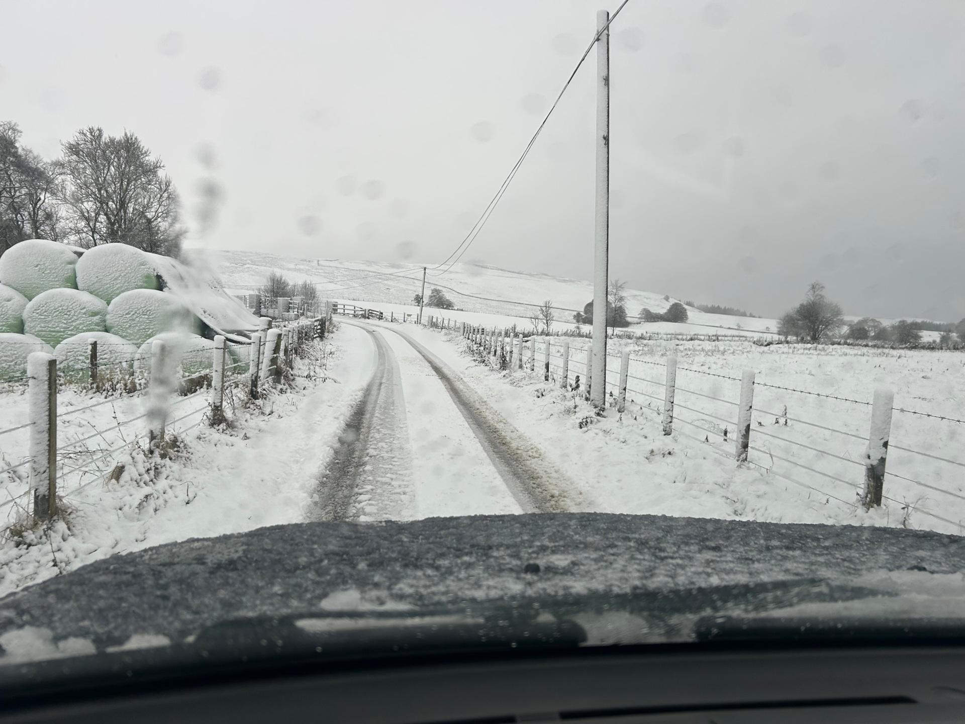 The drive from Ancrum to the farmhouse was slush mush. Passing through Roberton we saw Colin on his quad, presumably on his way to tend to his flock.