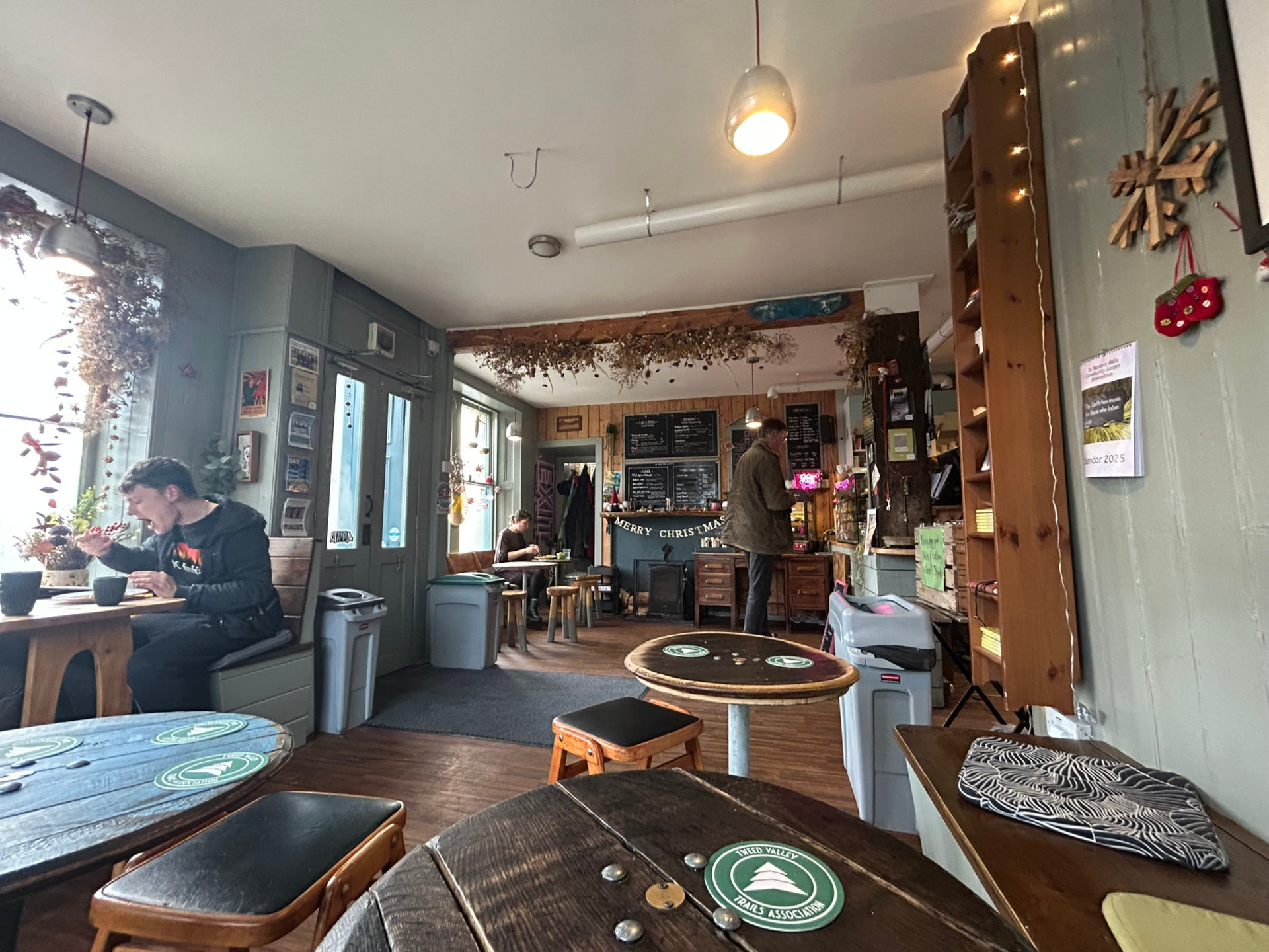 On the map, Falls of Clyde didn't seem that far, just a few miles North from Biggar. On the way, we stopped for some light lunch at a café in Innerleithen; this small town is a mecca of mountain bike riders, and is seemingly alternative.
