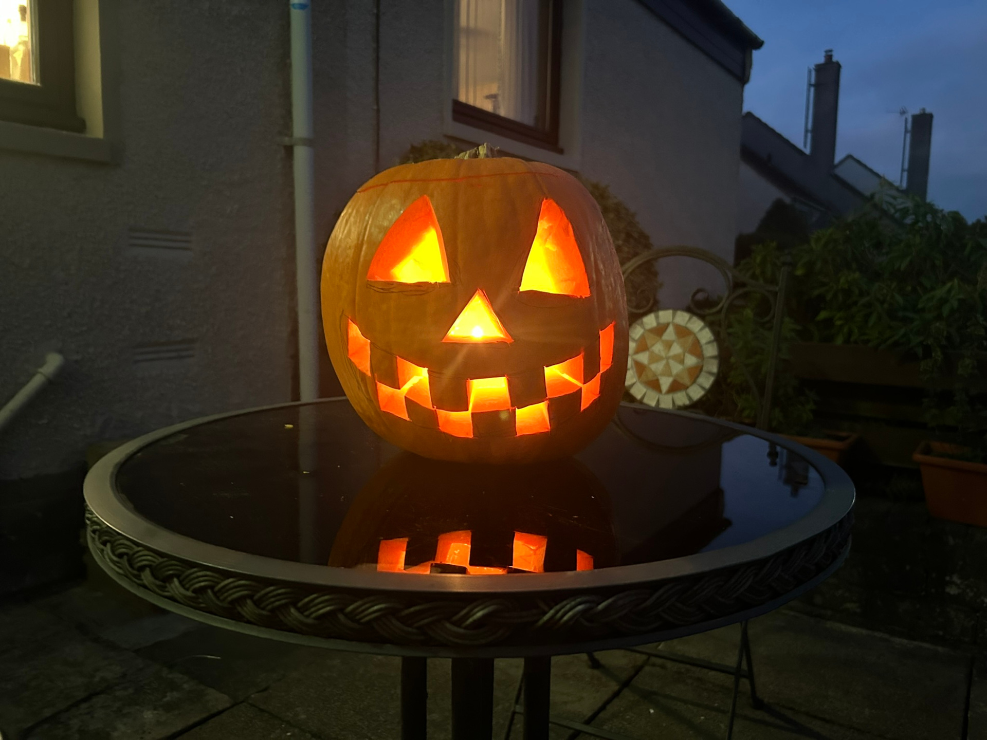 Charlie purchase a pumpkin and sweets for me to give to the trick or treating children of Ancrum. This is the first pumpkin I've made, in my fifty years on this earth!
