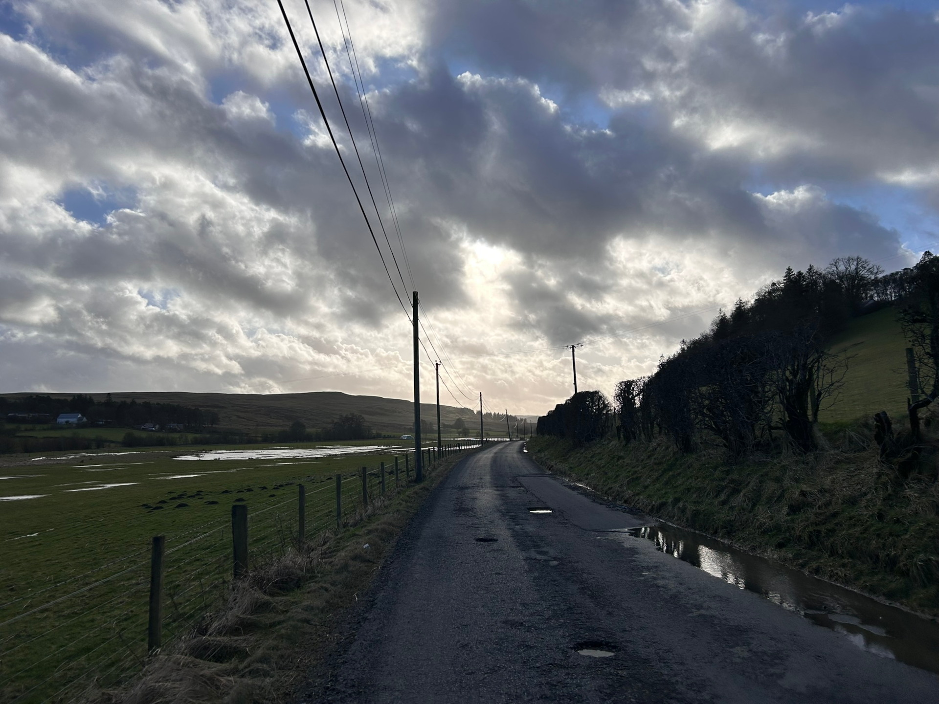 I retreated to the roadside, where I was backed off by a fence, in an attempt to blend my grey jacket with the tarmac of the road, after spooking the heron. In the background, Woodburn is visible.