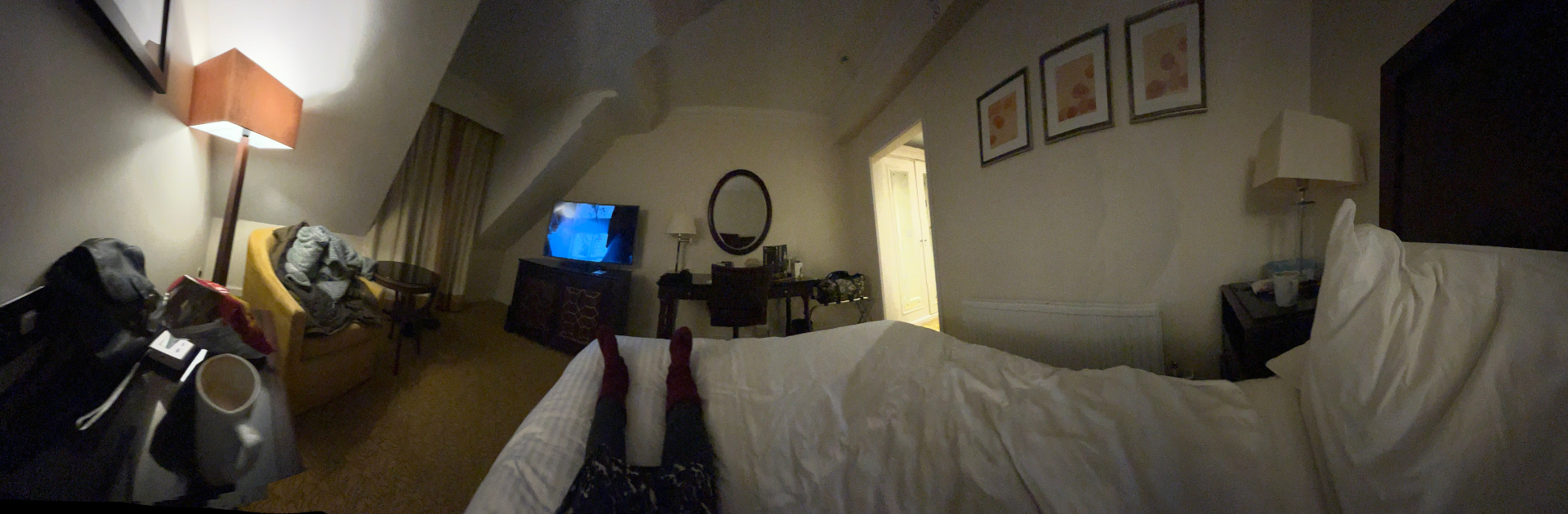 Room 322 at the Forest of Arden hotel was unclean, with peeling wallpaper, a malfunctioning smart TV that would repeatedly reboot, a cigarette burn on the net curtain, dusty furniture, fusty pillows, and a dirty shower curtain. This old "4-star" hotel is in dire need of a renovation.