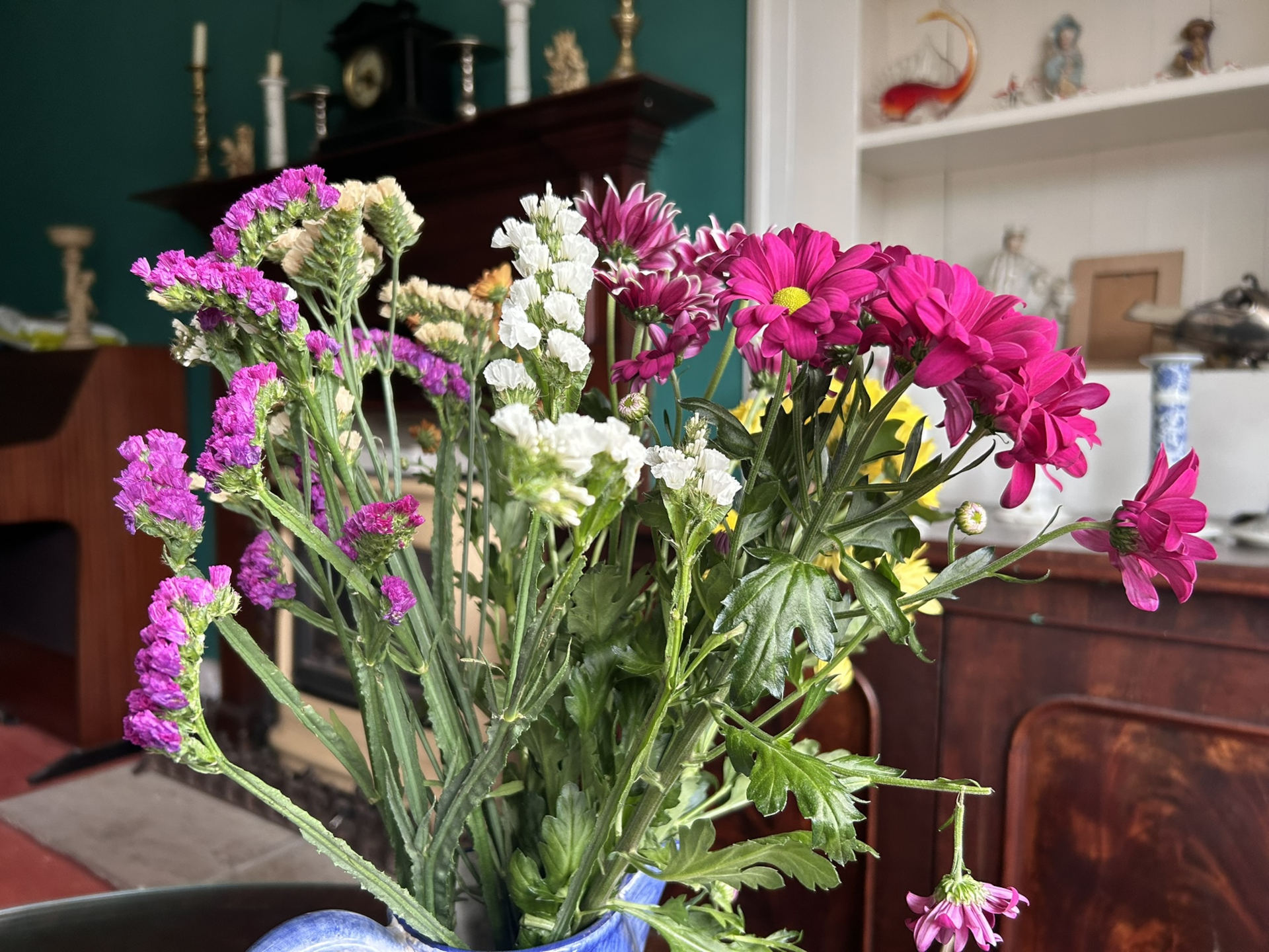 Recieved flowers at lunch time; placed them in a lemonade jar.