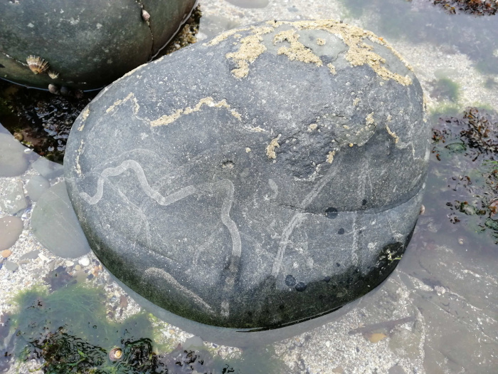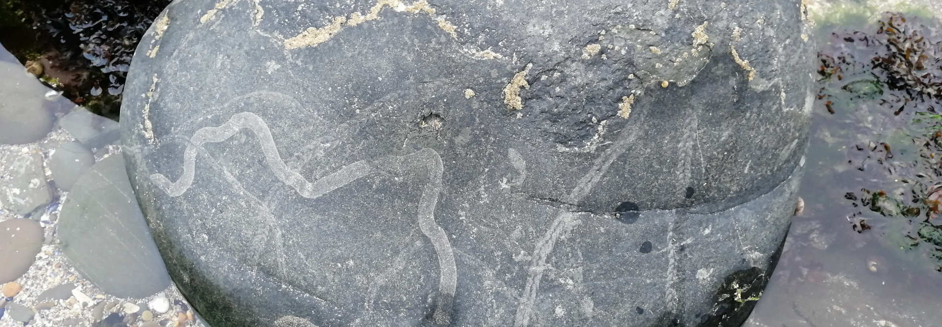 Close-up view of a collection of smooth, grey stones, likely found on a beach. Several stones exhibit prominent white and light-colored veins or lines running through them. The stones vary slightly in size and shade, creating a textured and natural arrangement. The overall impression is one of natural beauty and the simple elegance of geological formations.