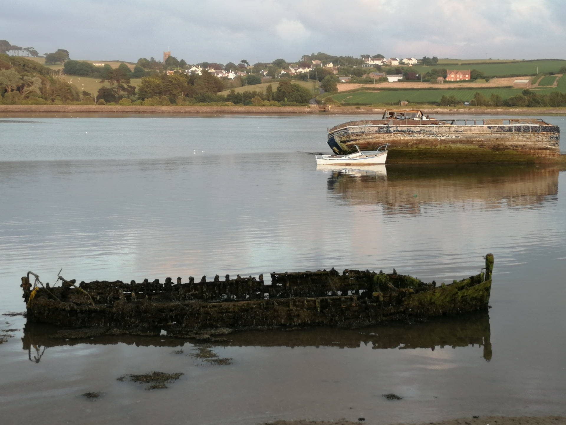 Calm body of water with a tranquil landscape in the background. In the foreground are two wrecked boats: one largely intact but decaying, covered in algae and partially submerged, and a smaller, more decomposed wreck. A small, seemingly functional boat is moored near the larger wreck. The background features a picturesque village nestled amongst rolling hills.