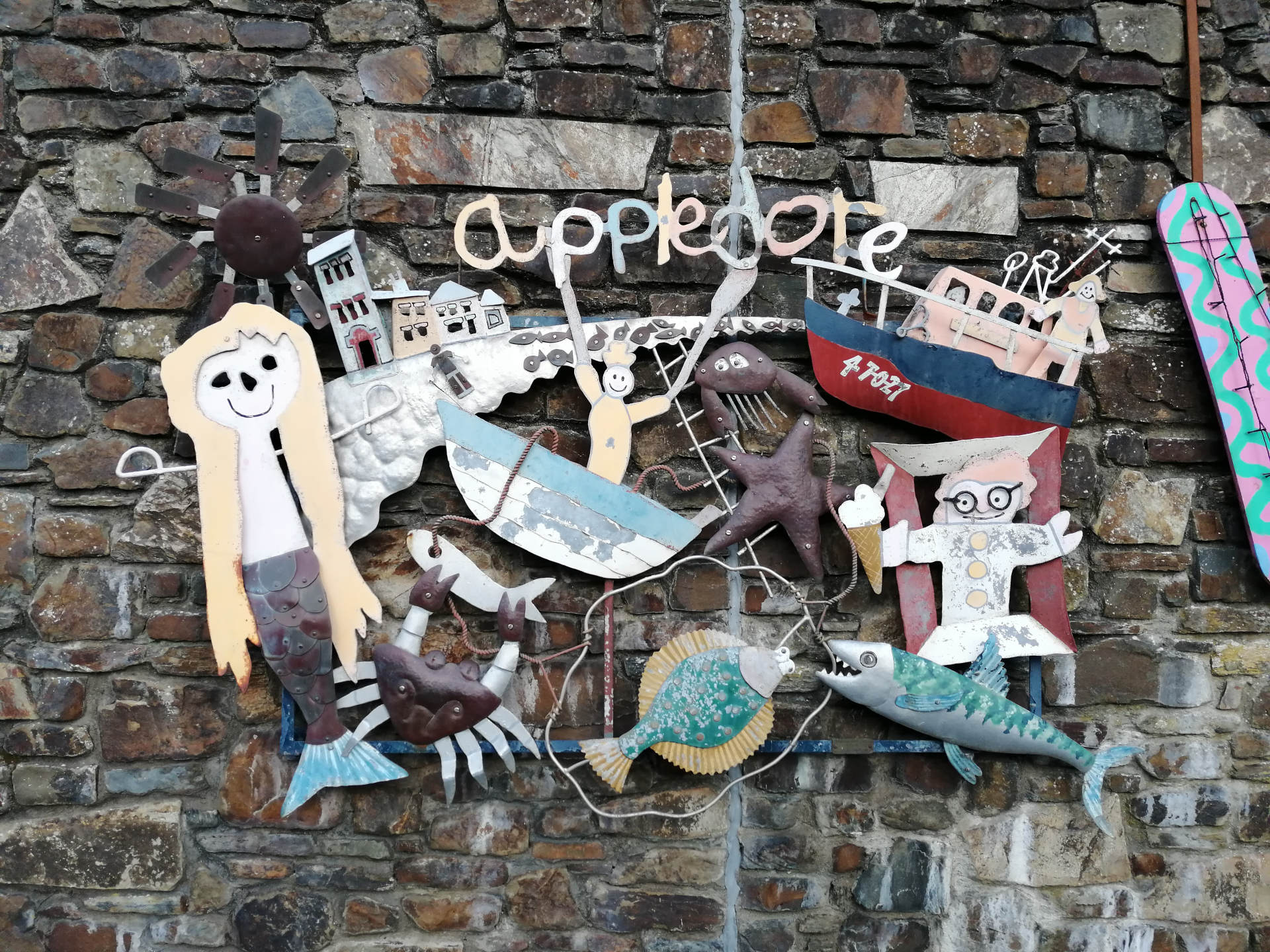 Whimsical, handcrafted artwork affixed to a stone wall. The piece is a collage of repurposed metal, featuring a mermaid, boats, fish, a crab, and other sea-related imagery, along with buildings and the word Appledore prominently displayed. The style is naive and childlike, with bright colors and simple forms. The overall effect is playful and charming, suggesting a coastal or seaside location.