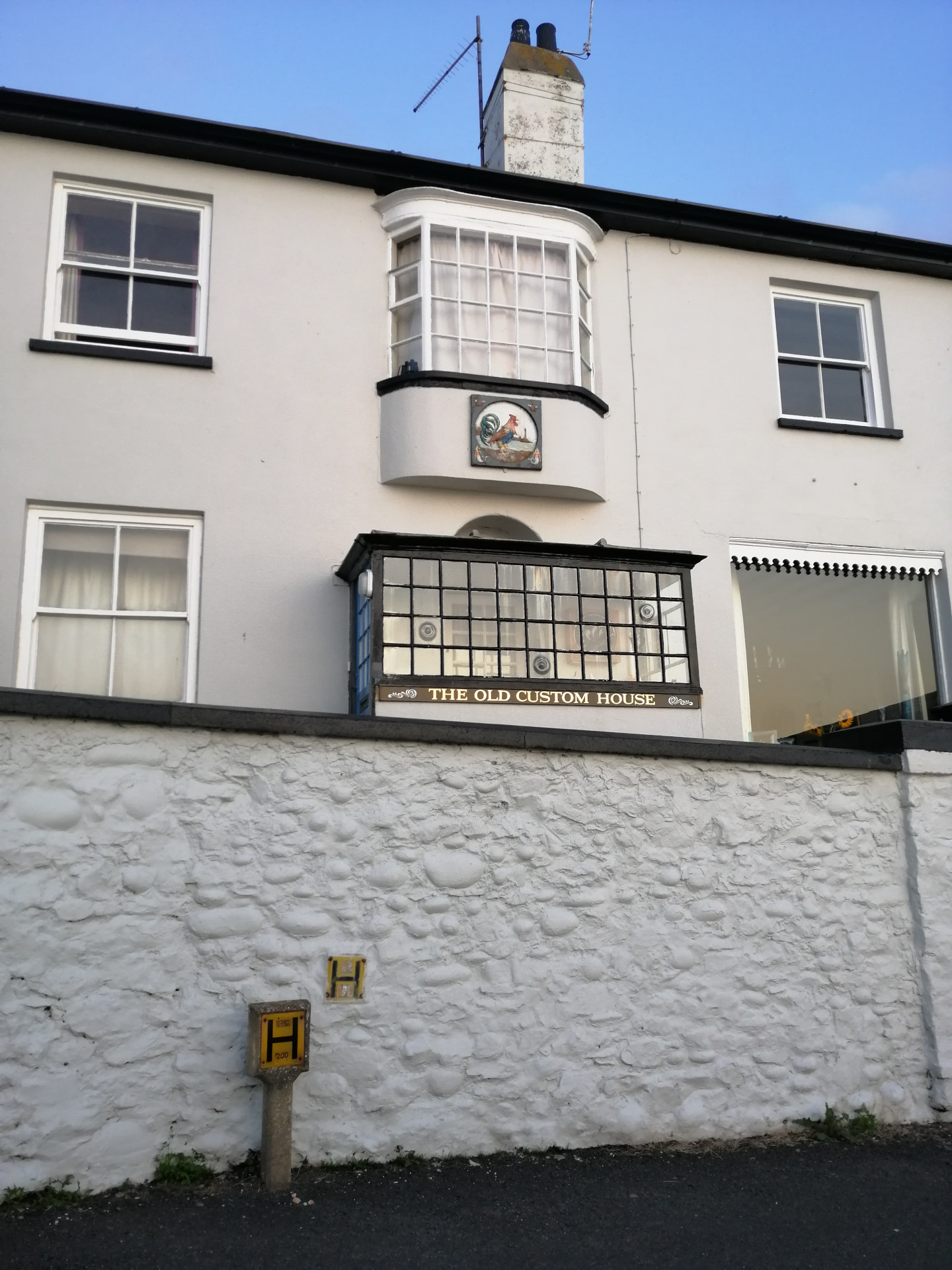 Two-story building, identified as The Old Custom House, with a whitewashed stone wall in front. The building features a bay window with a decorative tile depicting a bird, likely a rooster or similar fowl. There's also a smaller, black-framed window box below the bay window. A hydrant marker is visible on the wall. The overall style suggests an older building, possibly historic.