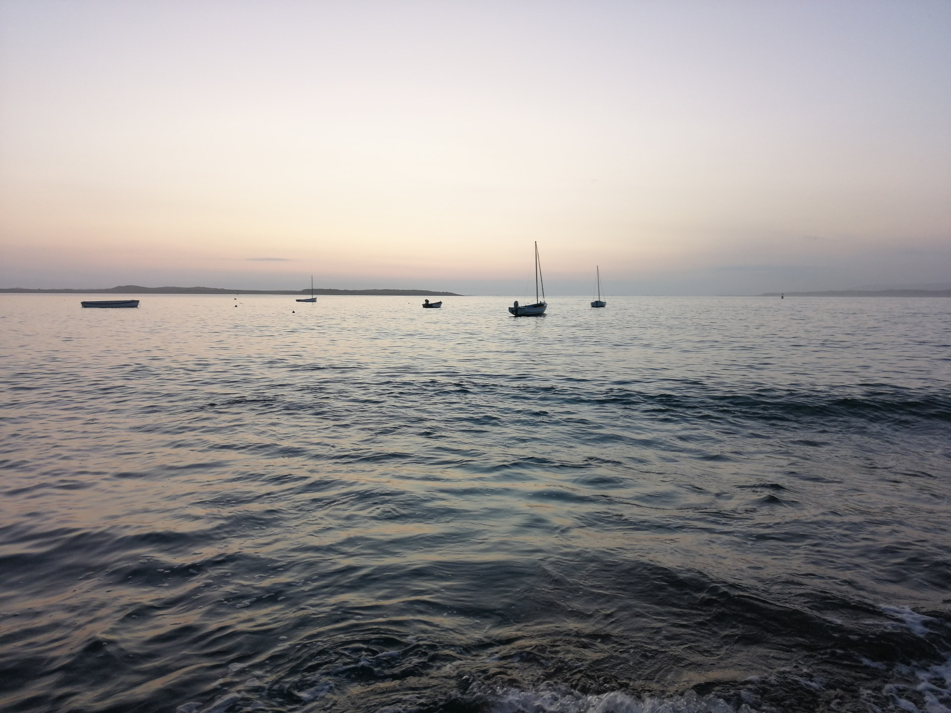Calm sea at sunset or sunrise. A few small boats, including sailboats, are visible on the horizon. The sky is a pale, soft colour, and the overall mood is serene and peaceful.