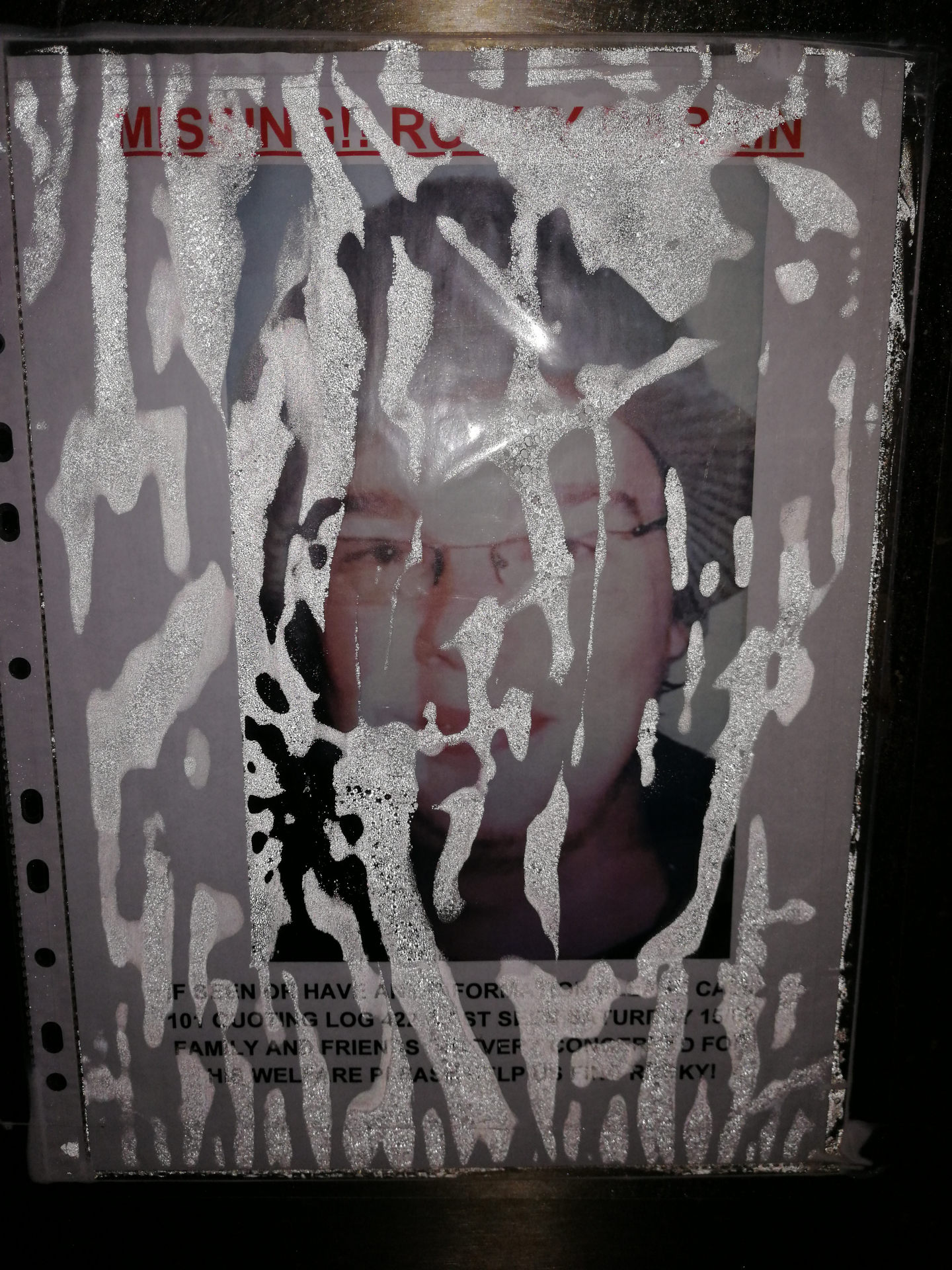 Partially obscured missing person poster. The poster features a photograph of a person with glasses, wearing a hat. The photo is heavily vandalised or defaced with white splotches and streaks, obscuring much of the person's face and the text below the photo. The visible text indicates the individual is missing and includes contact information, although much of it is illegible due to the damage. The overall effect is one of decay and despair, highlighting both the missing person's vulnerability and the indifference or hostility of the act of vandalism. The image’s story is one of loss, potentially compounded by the disrespect shown through the defacement of the poster, emphasizing the vulnerability of the missing person and the helplessness of those seeking them. The moral implication is a commentary on the fragility of life, the importance of community support in times of crisis, and also perhaps a reflection on urban decay and societal apathy.