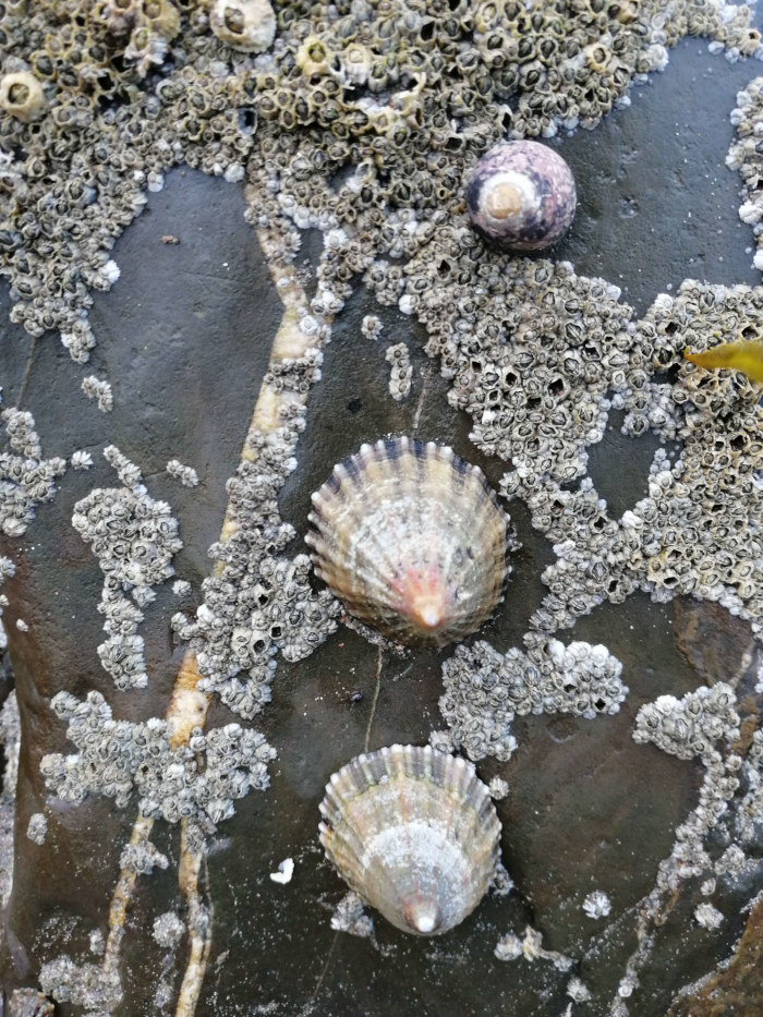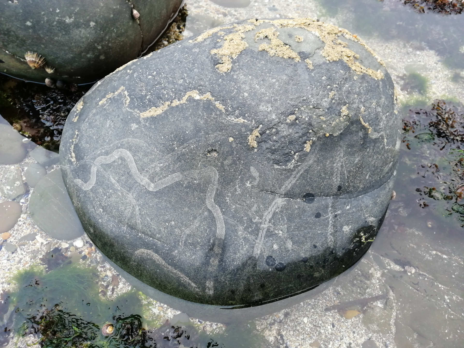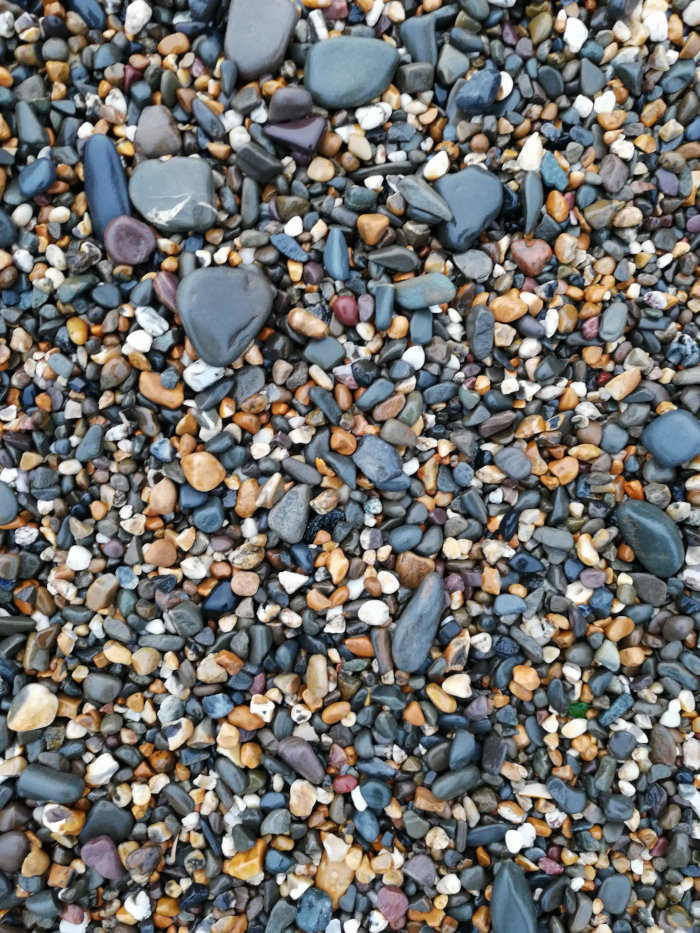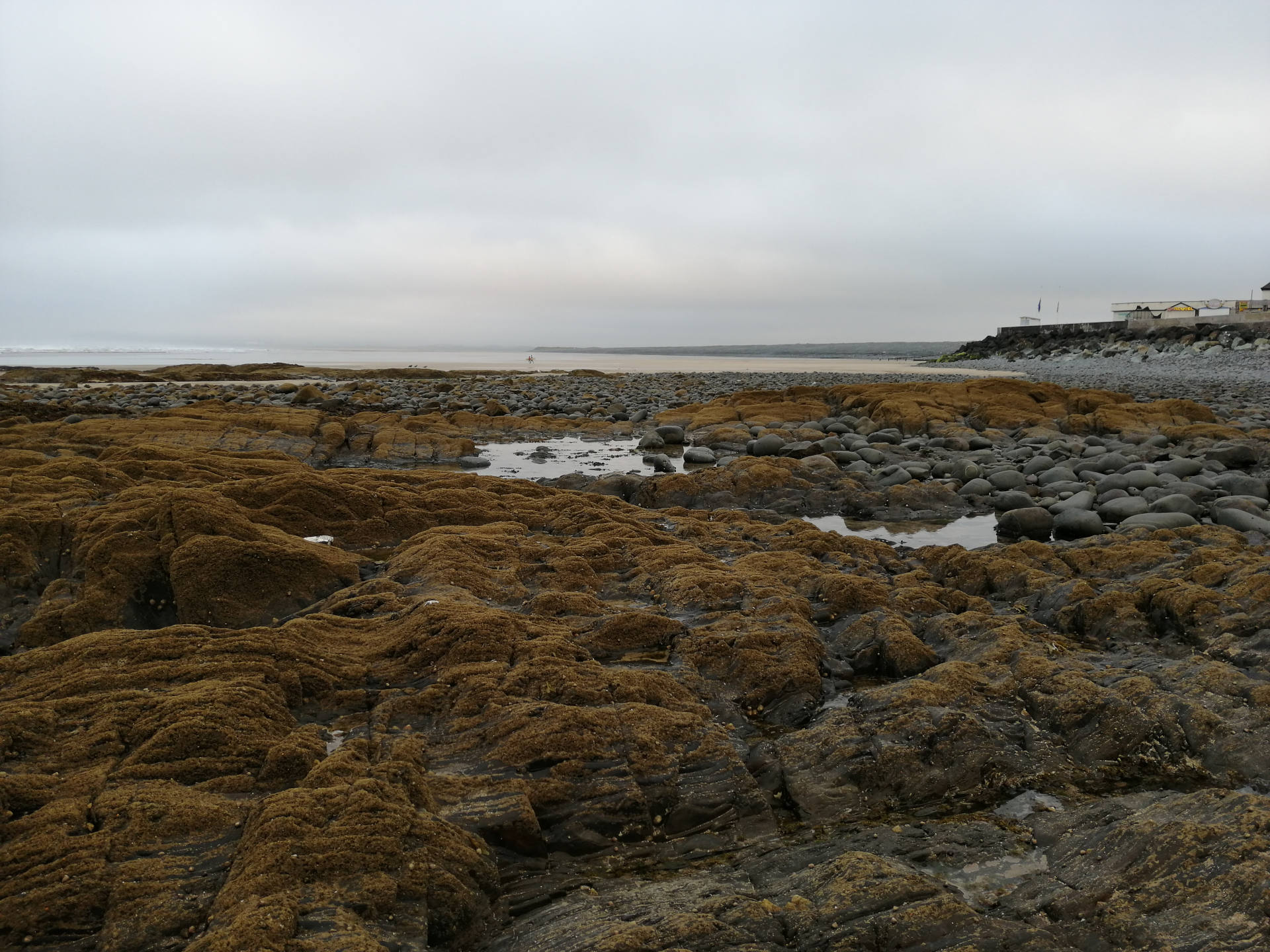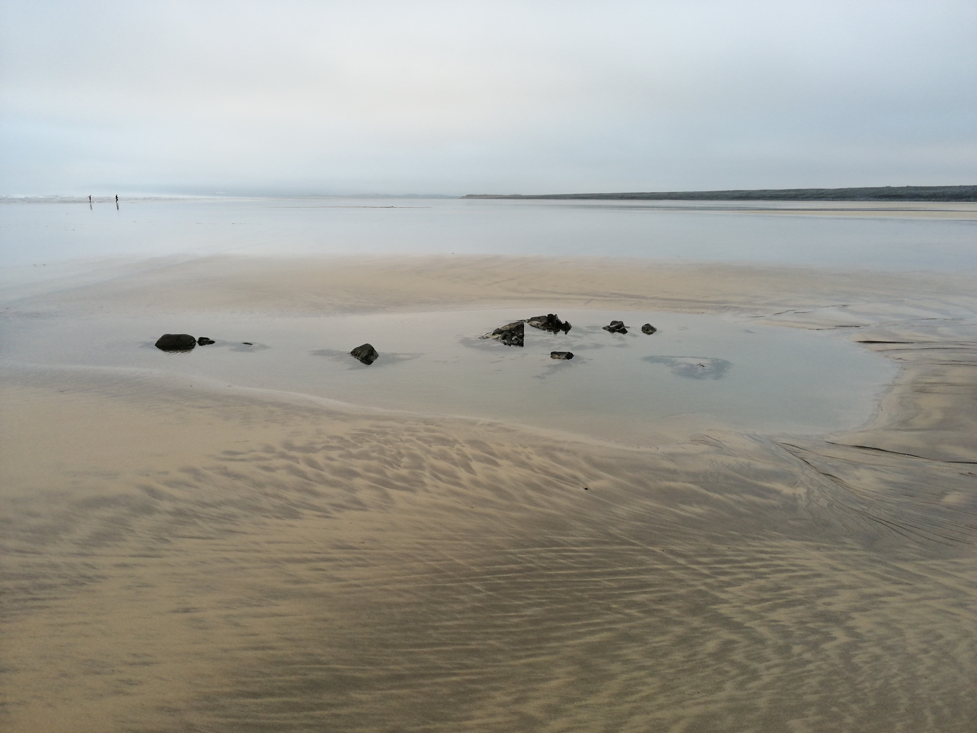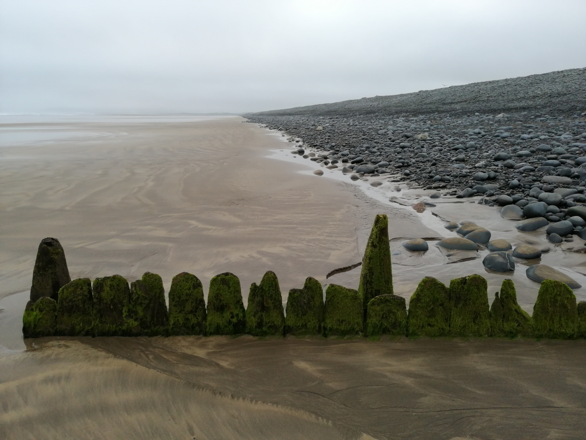 Wide, sandy beach under a grey, overcast sky. A low, moss-covered, wave-break structure runs horizontally across the lower third of the image, partially submerged in the wet sand. Beyond that, a substantial area of dark, rounded stones extends to the right and into the background, creating a contrast with the smoother sand.