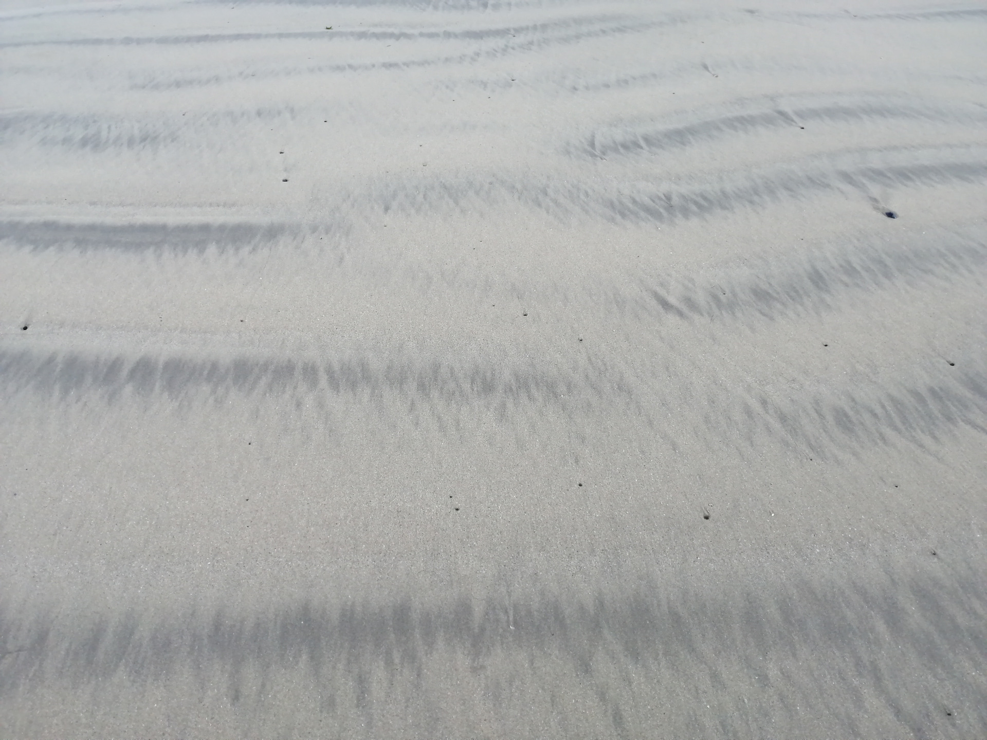 Close-up view of a sandy beach. The sand is light gray with darker gray streaks and patterns created by the wind or water. The texture is smooth but shows the ripples and undulations caused by the movement of the sand. There are a few small, dark specks scattered across the surface. The overall impression is one of simplicity and natural texture.