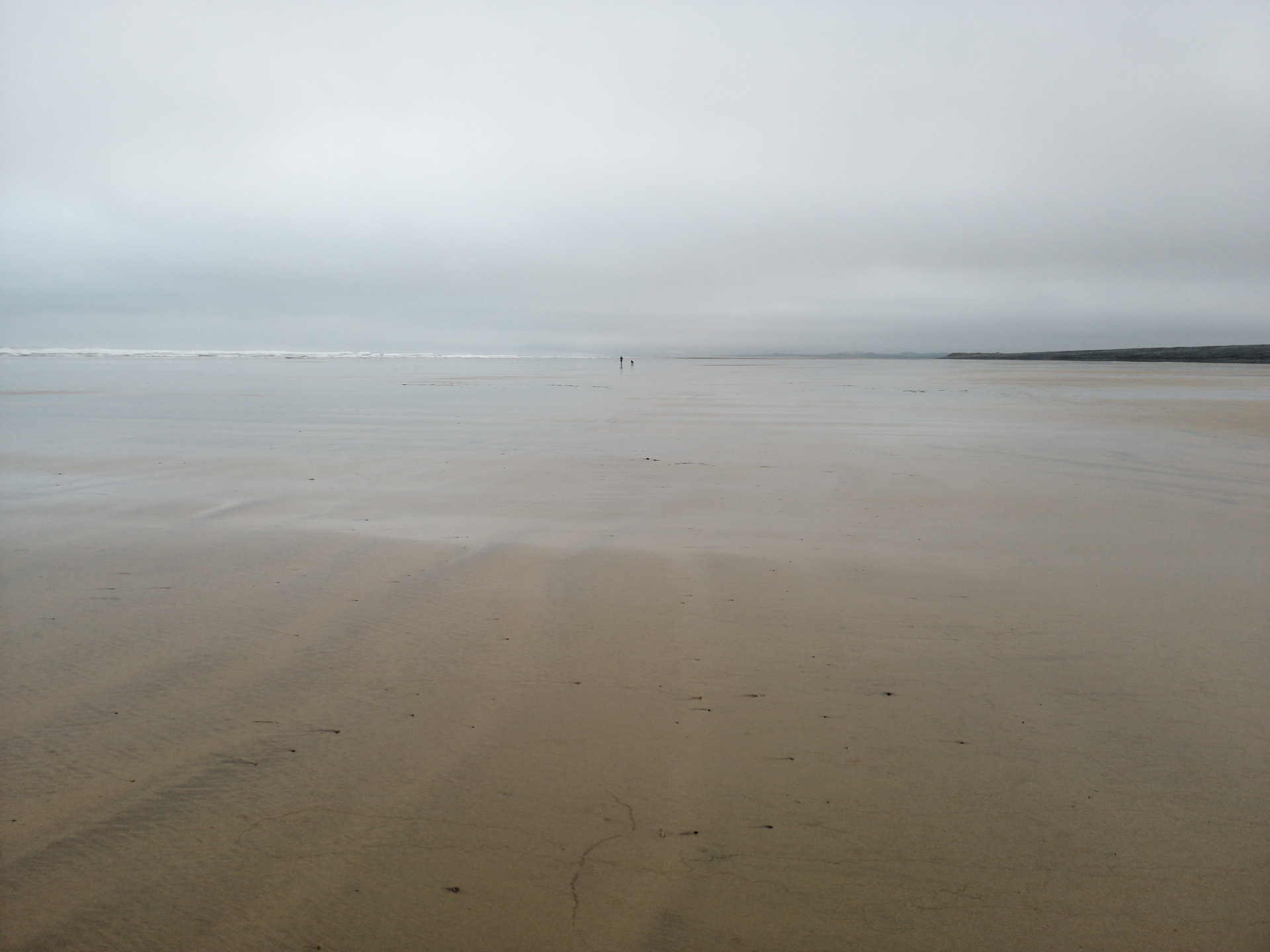 Wide, expansive beach scene under a muted, overcast sky. The sand is a light beige, wet in places, and stretches to the horizon where a faint line of ocean meets the sky. Two tiny, distant figures are barely visible near the waterline, suggesting vastness and solitude. The overall mood is calm, quiet, and somewhat melancholic due to the grey tones dominating the image.