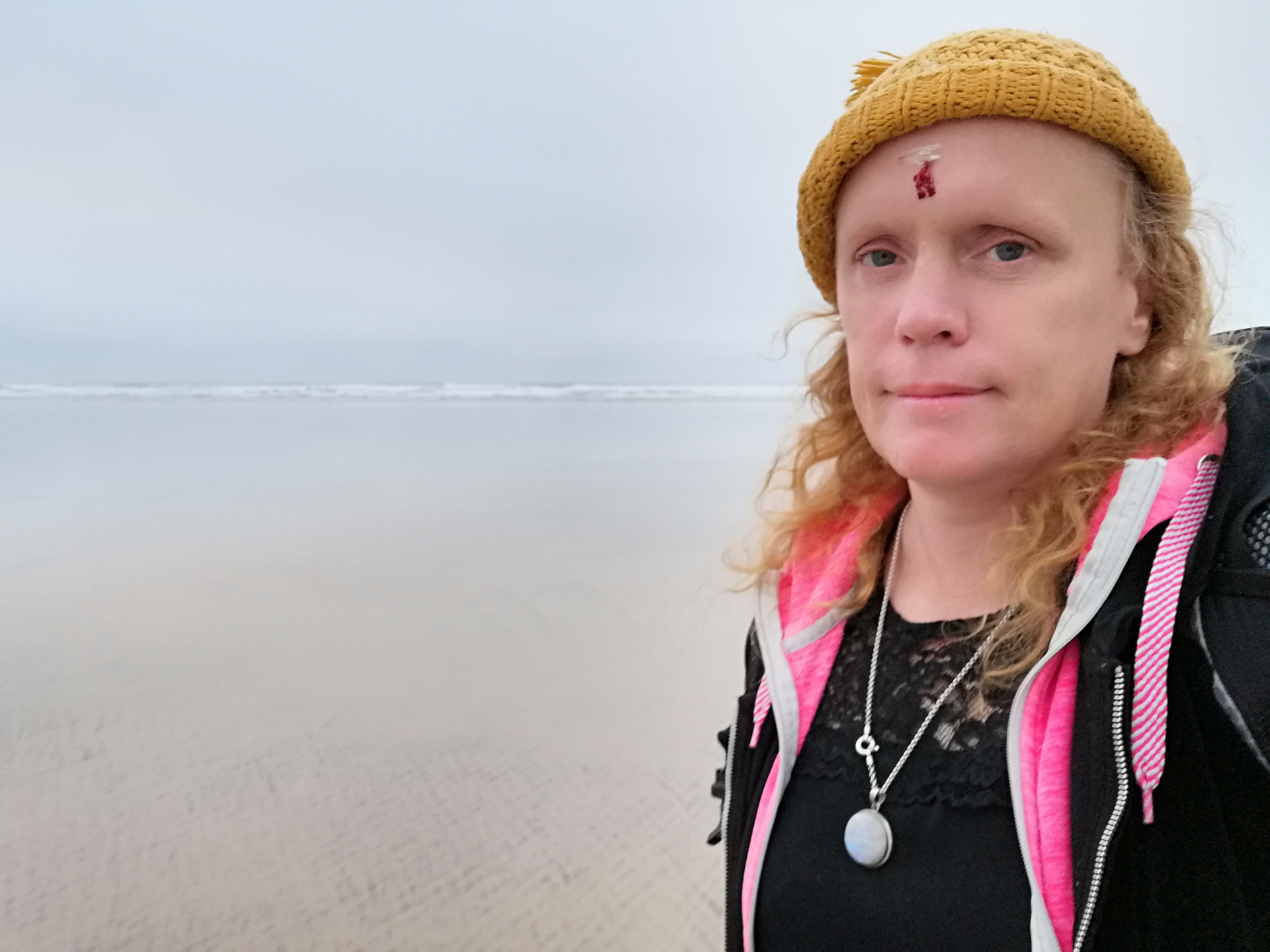 Leonie standing on a beach, facing the camera. She has shoulder-length curly auburn hair, and wears a mustard-yellow knitted hat and a black jacket with a pink hood. A small, dark mark resembling a bindi is visible on her forehead. She is wearing a necklace with a moonstone pendant. The background is a hazy, pale beach and ocean. The overall mood is serene and contemplative.