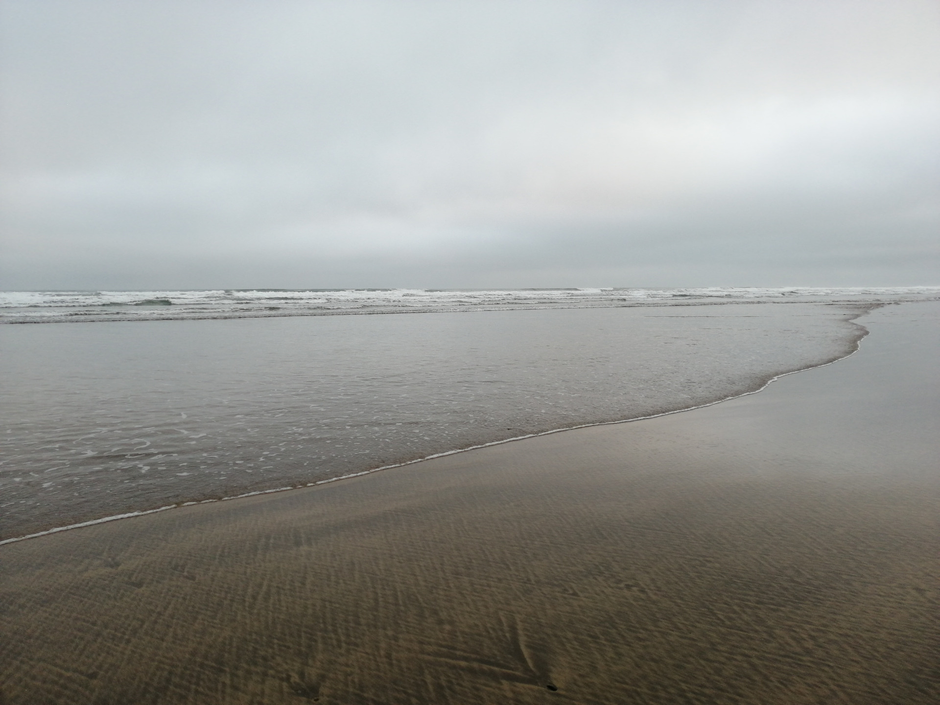 Tranquil beach scene on an overcast day. The water is calm, with gentle waves lapping the shore. The sand is wet and shows patterns from receding water. The overall mood is serene and muted due to the grey sky and subdued colours.