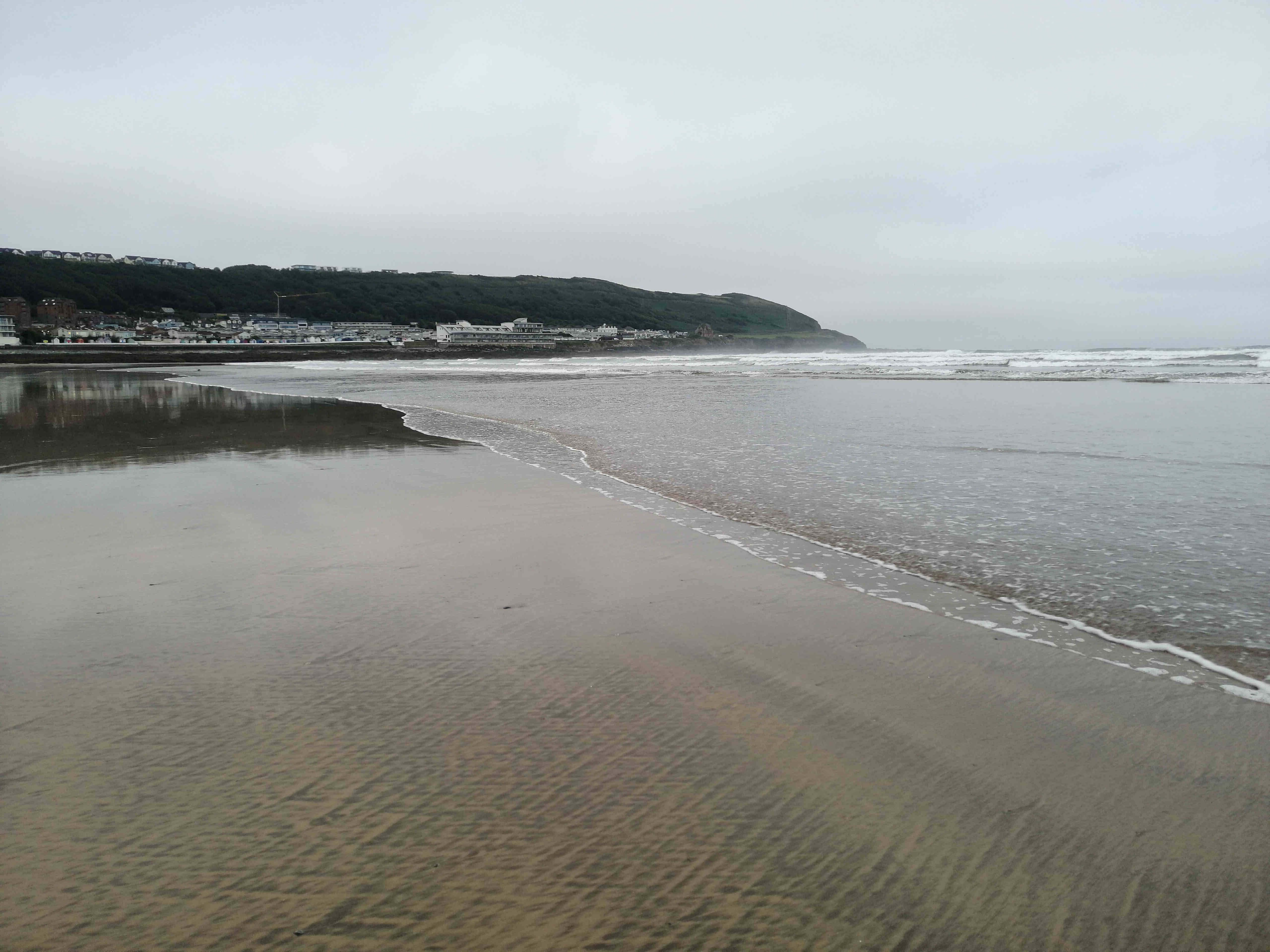 Wide, sandy beach with gentle waves lapping the shore. In the background, a line of buildings is visible against a low, green hill under a cloudy sky. The overall mood is serene and somewhat muted due to the overcast conditions. The sand shows patterns created by the receding tide.