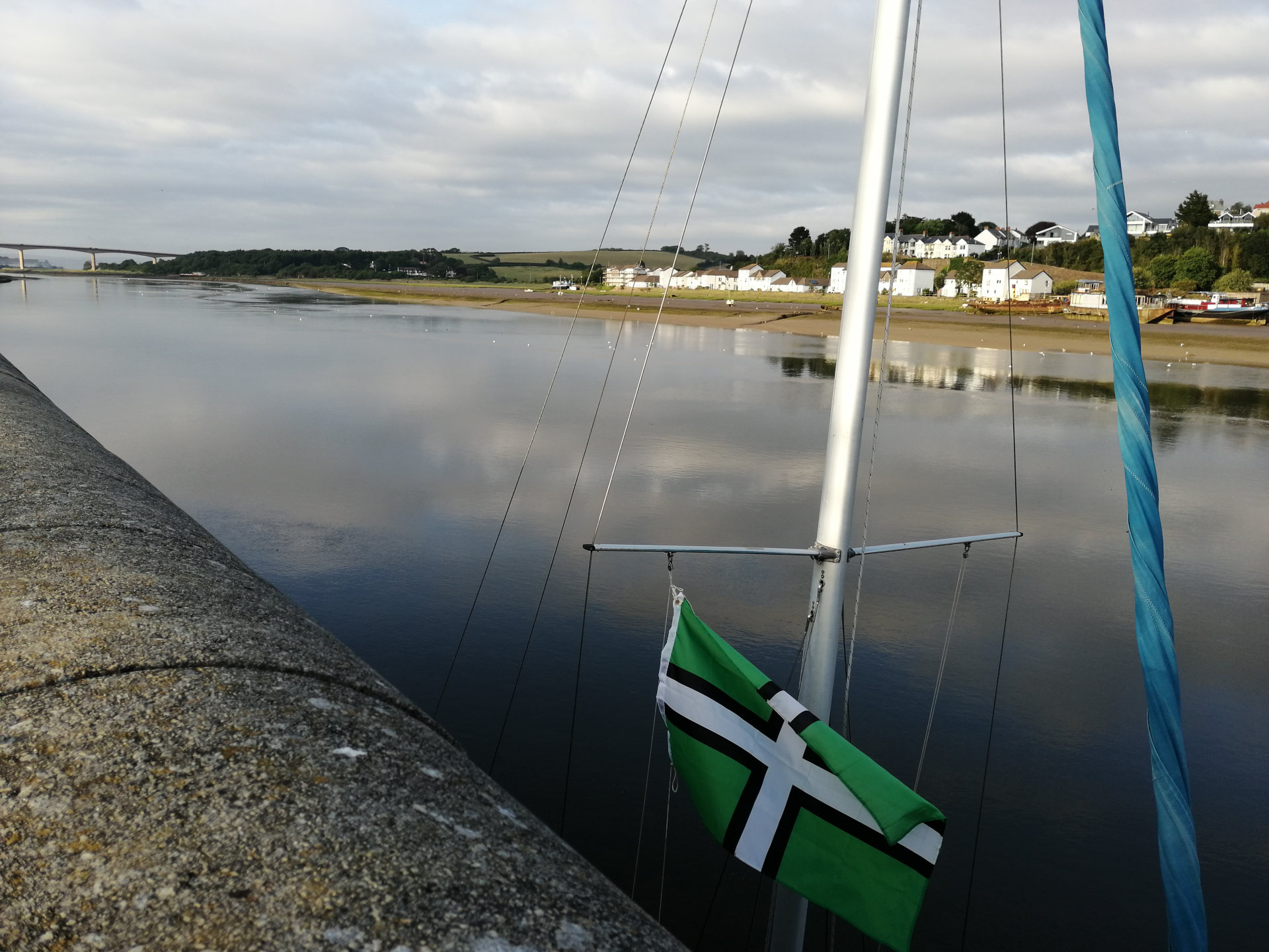 Calm river scene, viewed from a sailboat. A green and white flag, likely representing a region or county, is affixed to the sailboat's mast. In the background, a row of houses is visible on the riverbank, along with a bridge in the far distance. The overall mood is peaceful and serene. The focus is on the flag and the reflective water, creating a sense of place and possibly national or regional pride.