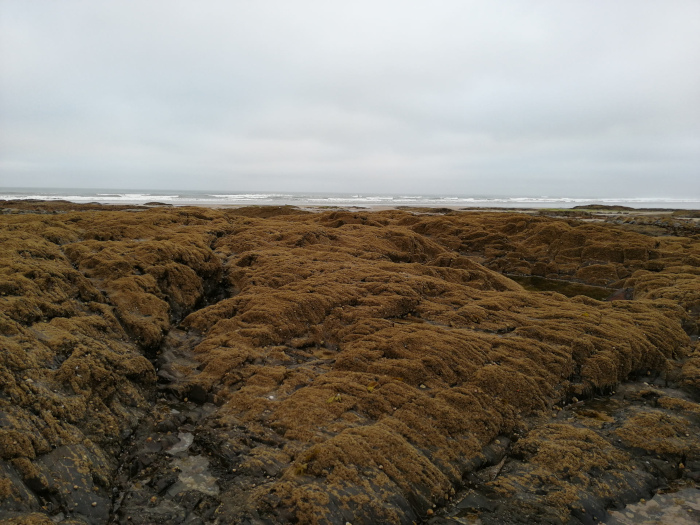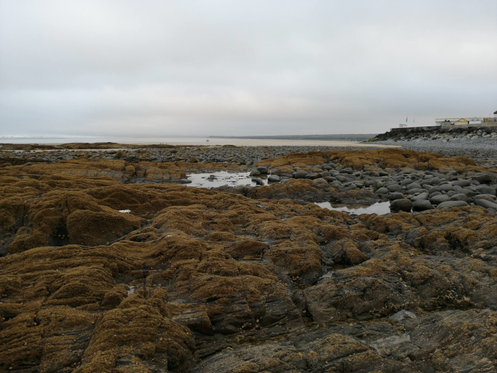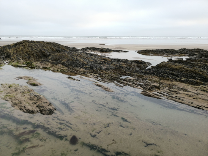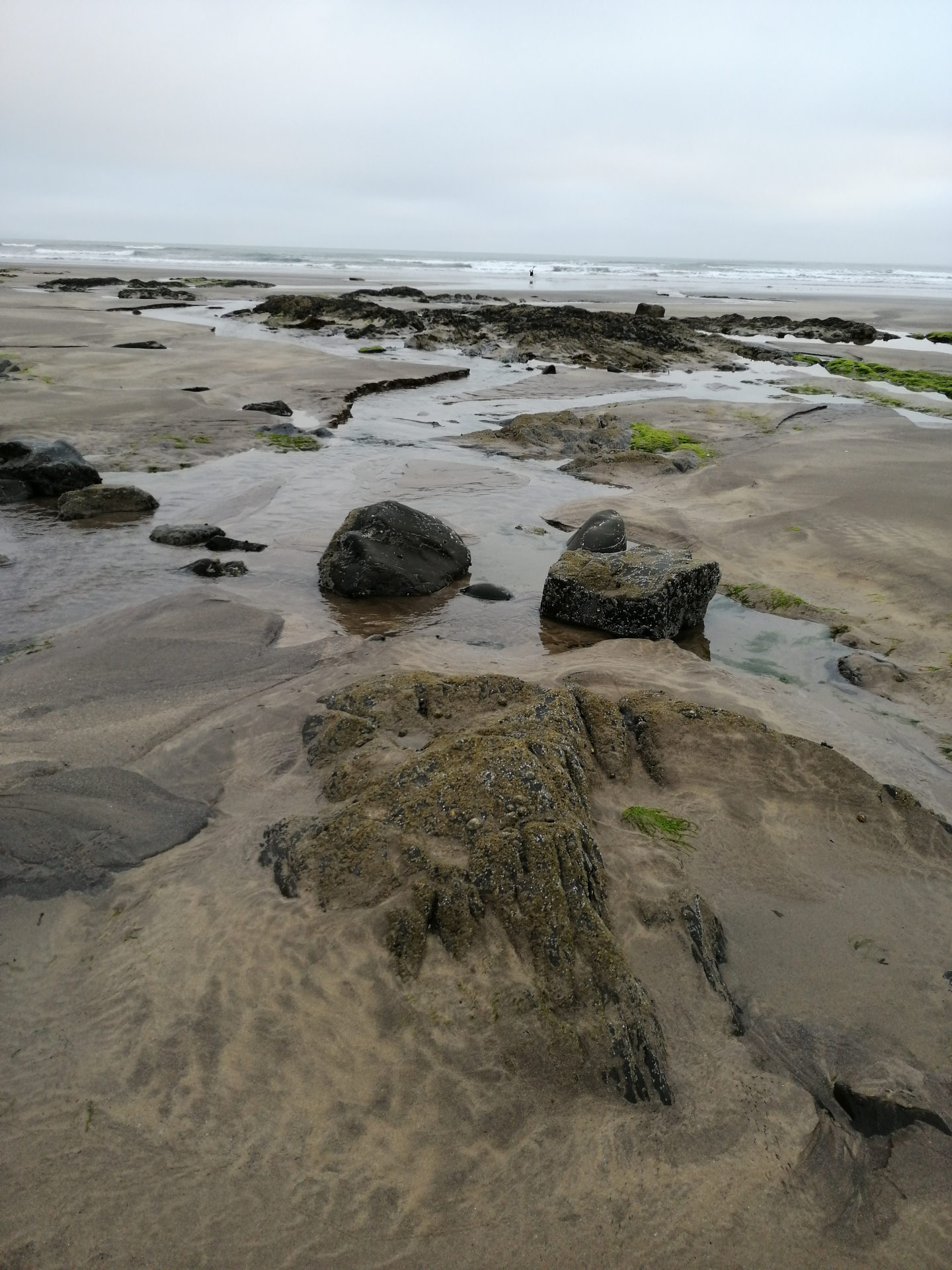 Sandy beach with dark rocks and small pools of water at low tide. Small streams of water cut through the sand, leading towards the ocean in the background, which is a calm grey-blue under a cloudy sky. Patches of greenish-brown seaweed are visible in some of the rock crevices and on the sand. The overall impression is one of a serene, yet somewhat desolate, coastal scene.