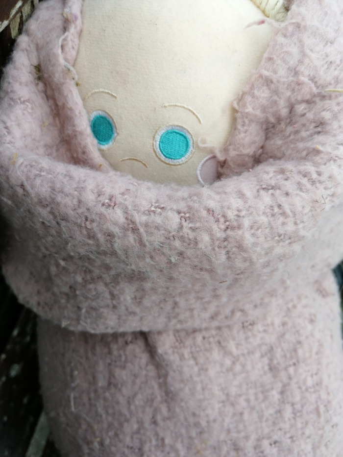 Leonie standing on a beach. She's wearing a yellow knit hat and a pink jacket. The beach is mostly sandy with a line of large, grey stones along the water's edge. The sky is overcast. There's a small, possibly symbolic, red mark on her forehead. She is directly facing the camera with a serious expression.