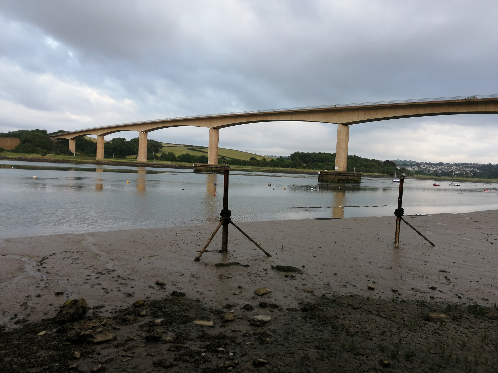 Long, high bridge extending across a calm body of water under a cloudy sky.  The foreground is a muddy, exposed shoreline with some rocks and two metal posts. A few small boats are visible in the distance on the water. The overall impression is one of a quiet, somewhat overcast day in a coastal or riverine setting.