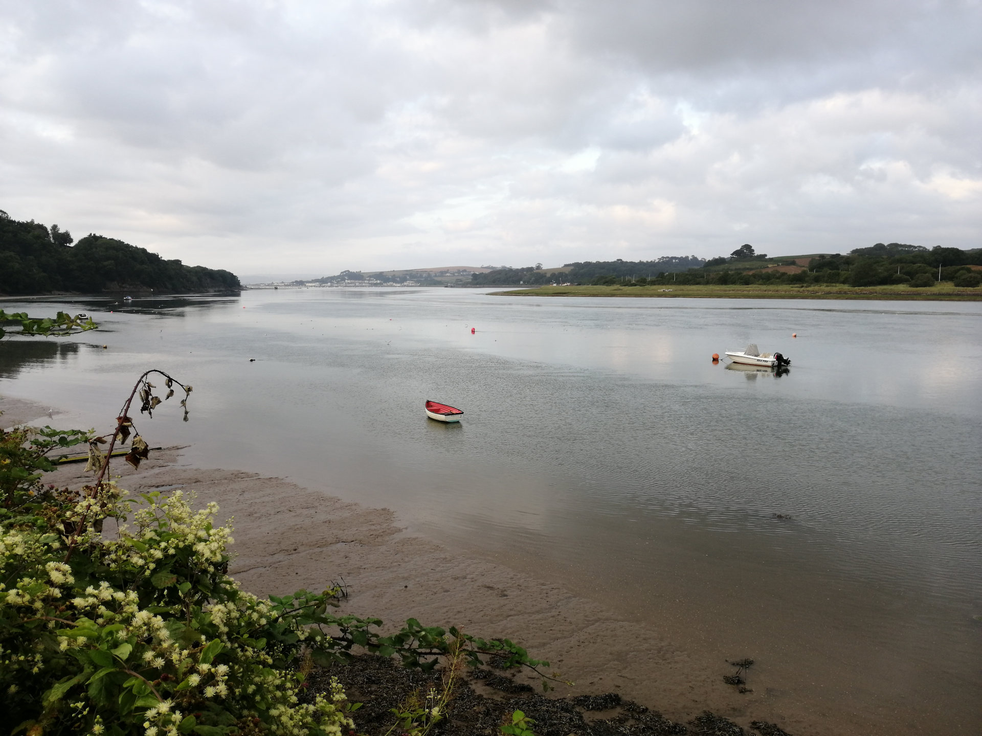Tranquil river scene under a cloudy sky.  The river is calm and wide, with a muddy shoreline visible in the foreground. Two small boats are visible on the water; a small white motorboat and a red rowboat. The far bank of the river is lined with low-lying vegetation and trees. The overall mood is serene and somewhat muted due to the overcast sky.